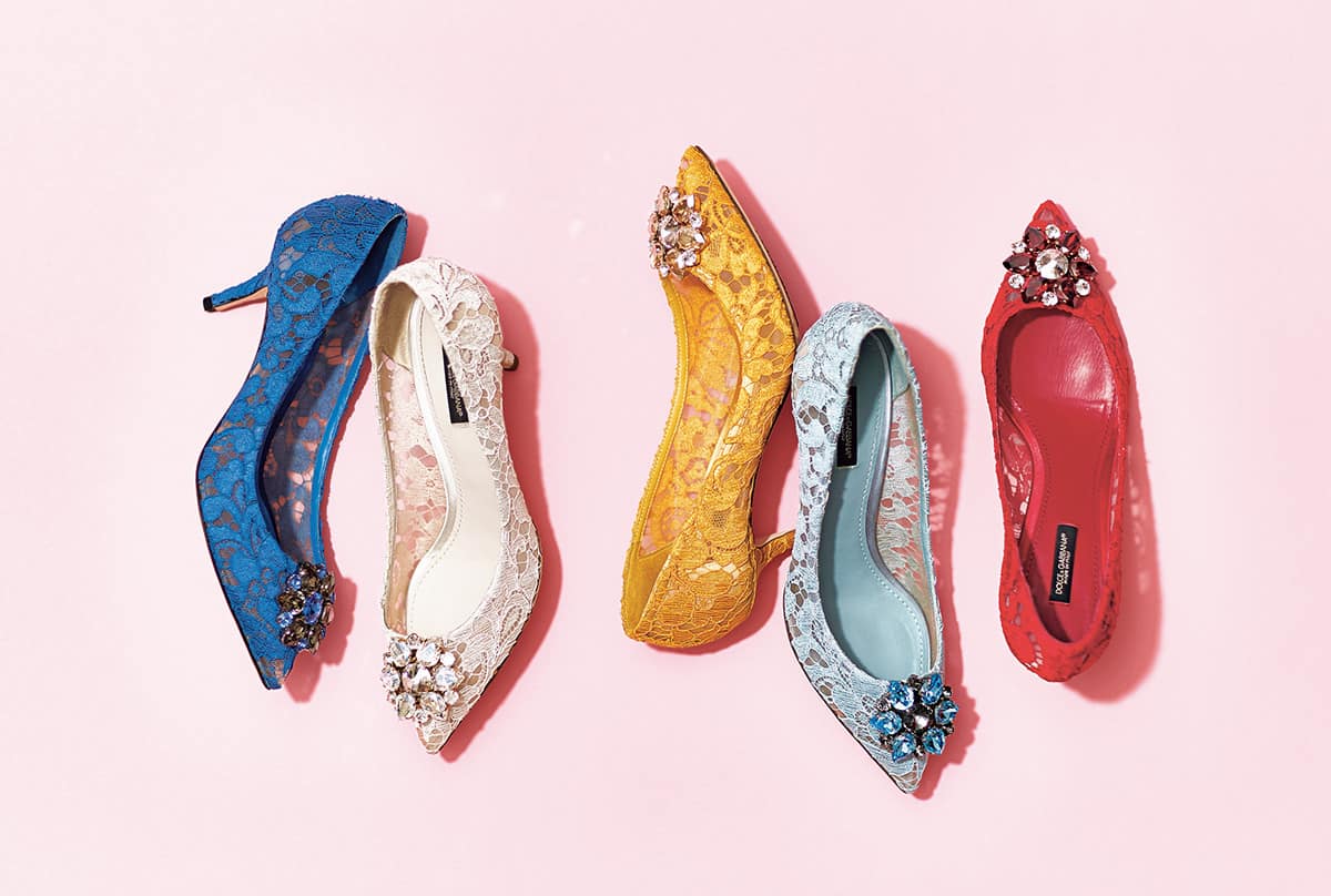 履くだけで華やかさをアピールできるカラフルなレインボーレースのパンプスは、美しいフォルムと足入れのよさが魅力。柔軟性のあるレースは締めつけないので、軽やかで履き心地も満点。トゥ部分にあしらったビジューがより一層の華やかさを演出する。 パンプス〈ヒール6cm〉各¥96,000(すべてドルチェ&ガッバーナ/ドルチェ&ガッバーナ ジャパン)