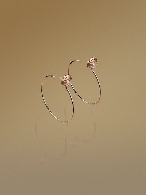 幾何学的で丸みを帯びた大小のカメリアのモチーフが3つ並んだピンクゴールドのリングは、2フィンガーリングとしての着用のほか、リングを重ねるように折りたたみ1本の指に付けるとモチーフがアシンメトリーに並び、異なる表情を見せる2WAY仕様。ピンクゴールドモデルに加えてホワイトゴールドモデルも登場するロングネックレスは、クリップ状のカメリアのモチーフを操作することで7通りもの着け方が可能になる、ユニークなデザインが特徴です。適度なボリュームを持ったしなやかなチェーンがモダンな印象のブレスレットは、カメリアのモチーフを押しながらスライドさせることでブレスレットの長さを自由自在に変更できます。さらに、オーバーサイズのフープがスタイリッシュなピンクゴールドのイヤリングや、0.7ctのダイヤモンドがセットされたホワイトゴールドのオープンリングもラインナップ。