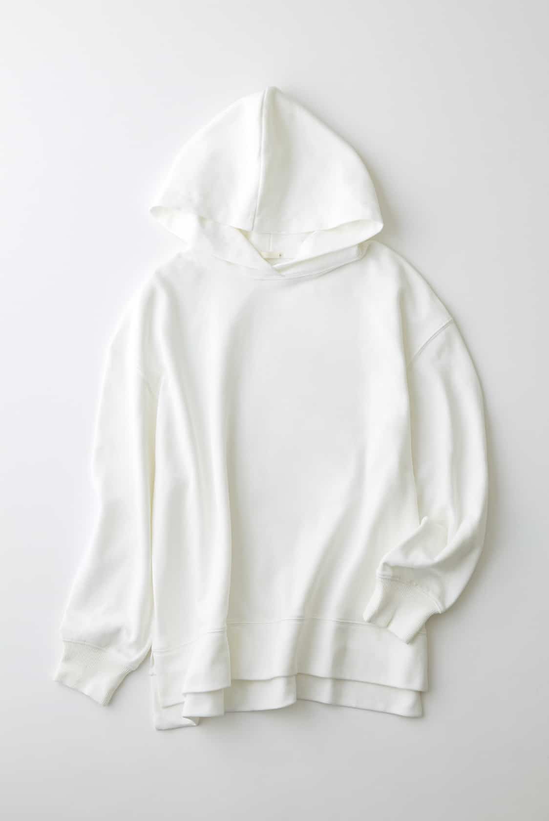 一枚ではもちろん、コートの中にも着やすいスウェット素材。なめらかな素材なのでキレイめに着こなせます。体型を選ばないオーバーサイズのシルエットは、腰周りもさりげなくカバー! カラー展開はオフホワイト・グレー・ブラック・オレンジ・グリーンの計5色。今回身長別に3名に着用してもらったのは、オフホワイトのMサイズです。「オーバーサイズスウェットプルパーカ」¥1,990(GU)
