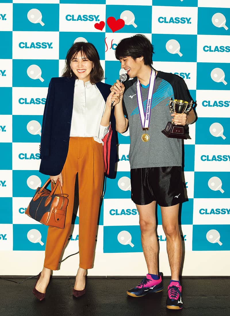 何だか隣から視線を感じる…。って、えー!ユニフォーム姿と印象違うし偶然にびっくり!イヤリング¥158,000 リング¥100,000(ともにウノアエレ/ウノアエレ ジャパン) バッグ¥229,000(トッズ/トッズ・ジャパン) 〈男性〉ニット¥3,200 カットソー¥3,400(すべてラコレ/アダストリアカスタマーサービス) 眼鏡¥34,000(アイヴァン/アイヴァン PR)