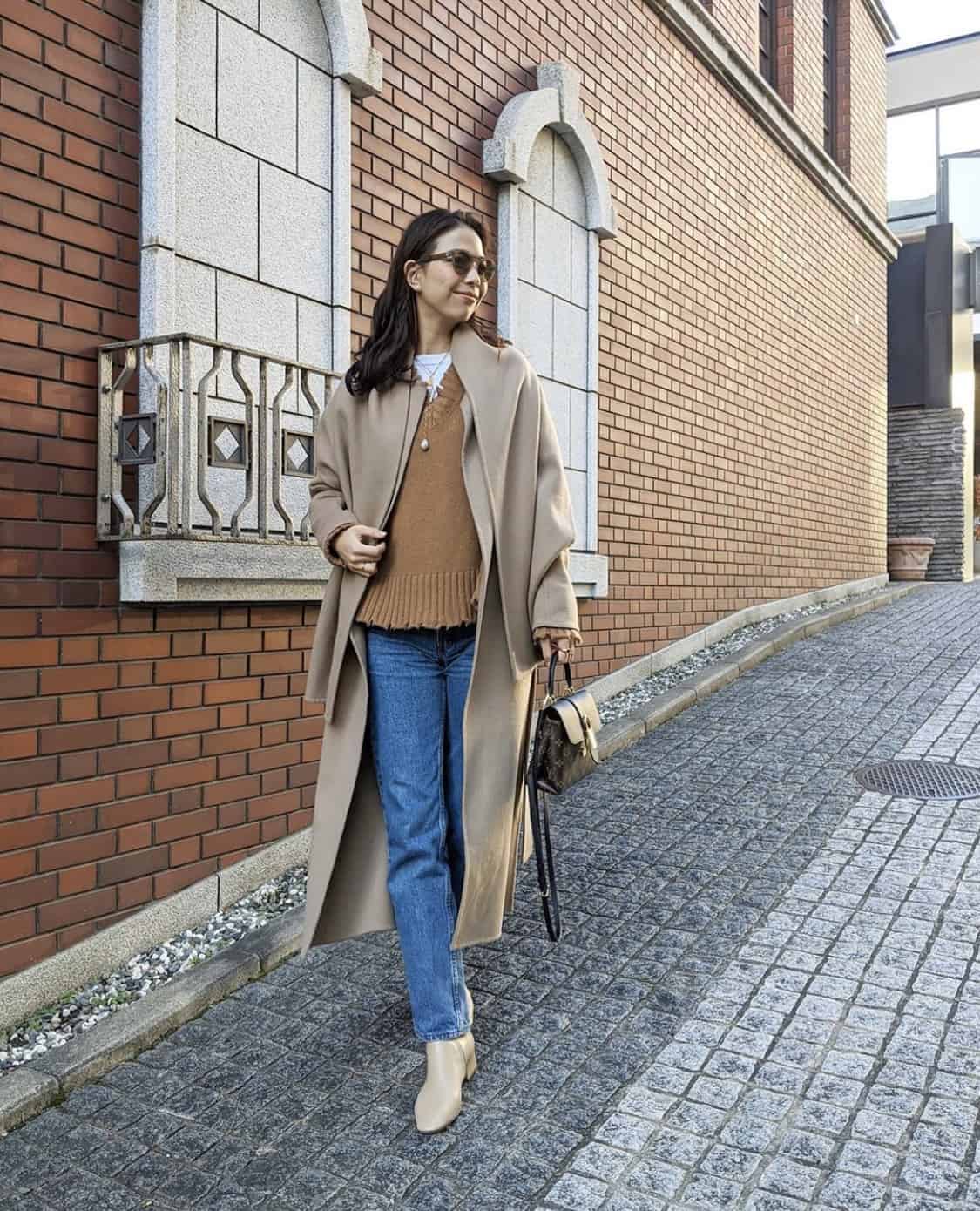 ストレートデニムとニットを合わせるなら、“短め丈のニット”が理想的なバランス。ベージュやブラウンのワントーンコーデで、インしなくてもスッキリと魅せることが出来ます。ニットの中に合わせた白いカットソーも、今年っぽいレイヤードスタイルです。