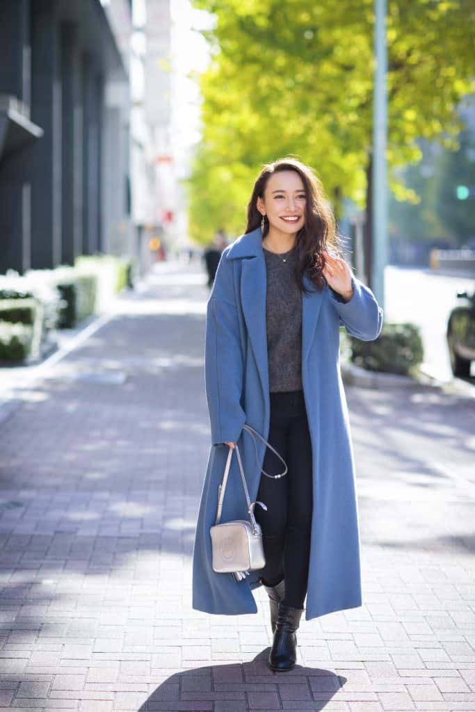 短め丈のダークグレーのニットに黒スキニーとブーツを合わせてスタイリッシュな印象に。ロングコートを主役にしたこなれたシンプルな着こなしがスタイルアップに一役買って、まるで海外セレブのようです。