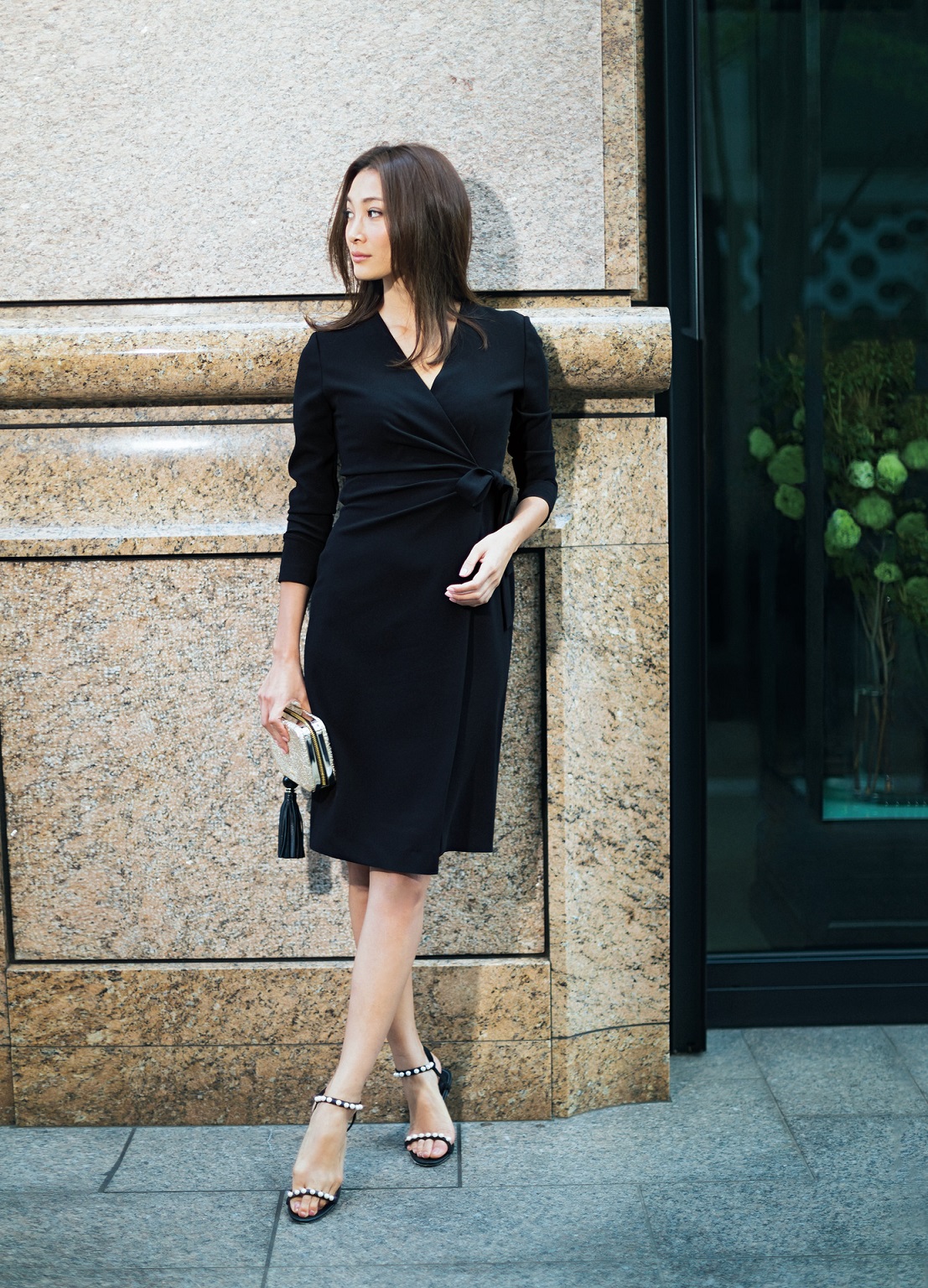 ストレートは存在感のあるメリハリ体型。体のラインをちょうどよく拾うラップワンピがよく似合います。ワンピース¥42,000(ダイアン フォン ファステンバーグ)バッグ¥82,000(ケイト・スペード ニューヨーク/ケイト・スペード ジャパン)サンダル¥23,000(ツル バイ マリコ オイカワ)
