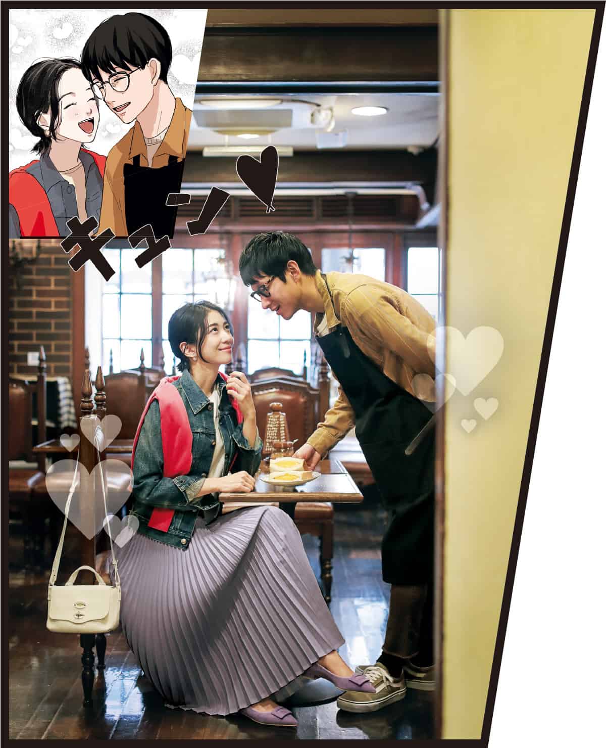 ドラマティックなプリーツスカートで思い切って開けた、「北風」の扉。漫画のことを訊ねたら「いつもここで楽しそうにお話ししてたまどかさんが、僕のヒロインだったから」。恥ずかしそうに教えてくれた。今の私、世界で一番幸せなヒロインだ♡ バッグ¥78,000(ザネラート/アマン)シューズ¥34,000(プリティ・バレリーナ/F.E.N.)ピアス¥5,891(アビステ)