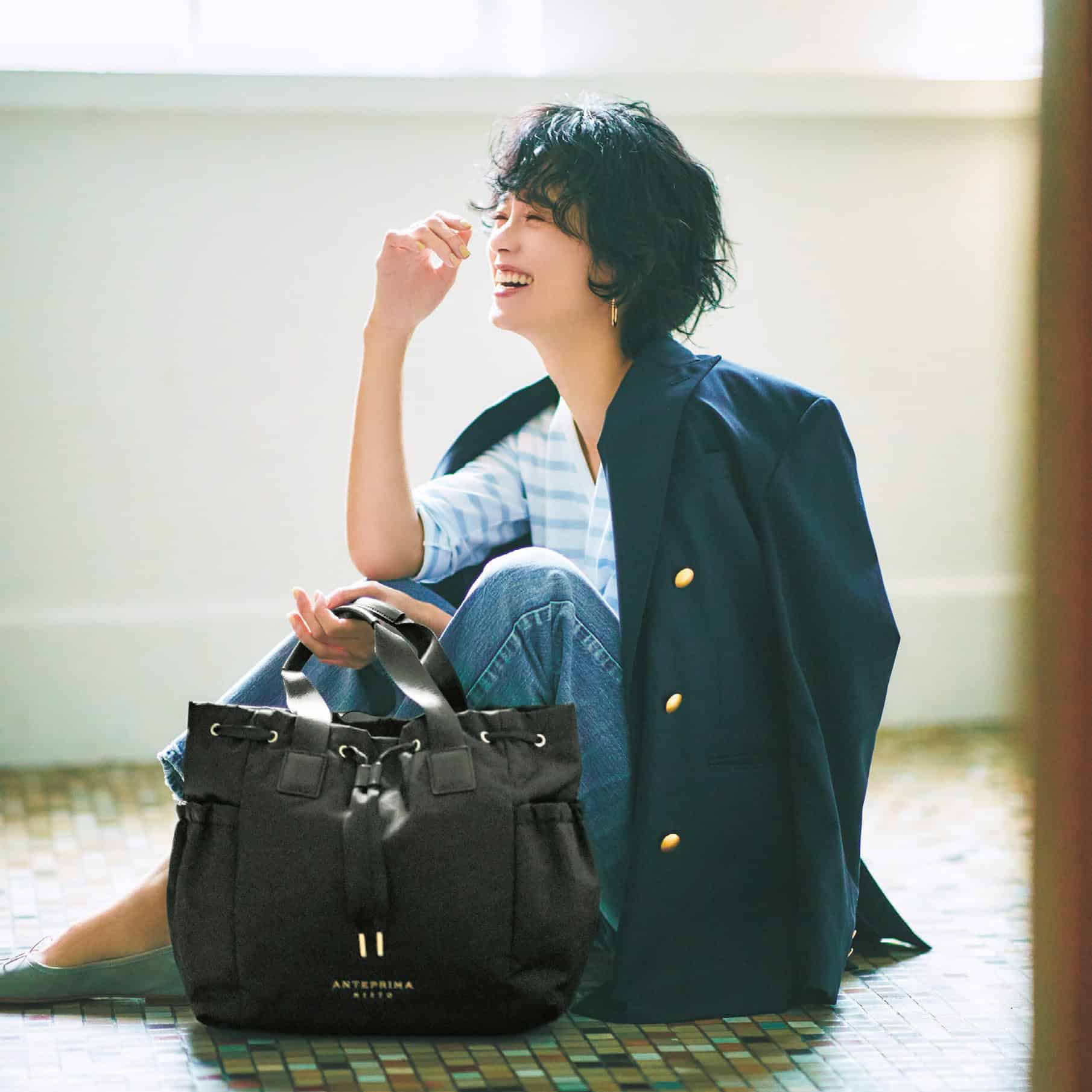トートバッグ¥28,000(アンテプリマ/ミスト/アンテプリマジャパン)ジャケット¥17,000(ノーク バイ ザ ライン/ノーク)カットソー¥11,000〈ルミノア〉パンツ¥23,000〈アッパーハイツ〉(ともにゲストリスト)ピアス¥4,200(JUICY ROCK)バレエシューズ¥26,000(スペルタ/フラッパーズ)