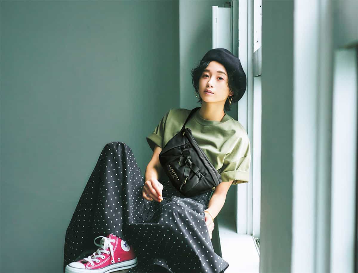 ボディバッグ¥21,000(アンテプリマ/ミスト/アンテプリマジャパン)Tシャツ¥9,800(スローン)スカート¥27,200(ティグレ エ ティグレ/シップスグランフロント大阪店)ベレー帽¥8,100(CA4LA/CA4LA ショールーム)ピアス¥4,800 バングル¥3,900(ともにJUICY ROCK)スニーカー¥5,800(コンバースインフォメーションセンター)