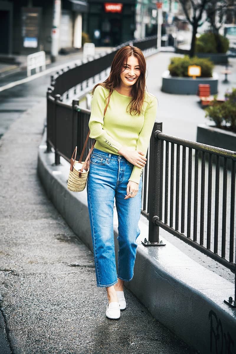 デニムパンツ「WEDGIE STRAIGHT」¥10,000(リーバイス®/リーバイ・ストラウス ジャパン)リブニット¥17,000(PINKY&DIANNE)バッグ¥34,000(HEREU/メゾン イエナ)ローファー¥62,000(JOSEPH/ウィム ガゼット ルミネ新宿店)リング¥9,800(アンセムフォー ザ センセズ/アマン)