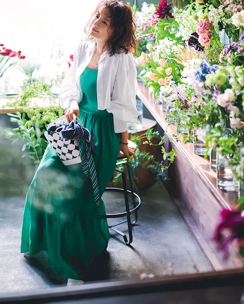 鮮やかなグリーンのワンピースの上に、短丈の白シャツを羽織ったリラックス感漂うコーデ。カジュアルな短丈シャツも、ワンピの上なら抵抗なく取り入れられるはず。天気のいい休日に着たくなる大人の女性らしいスタイリングです。