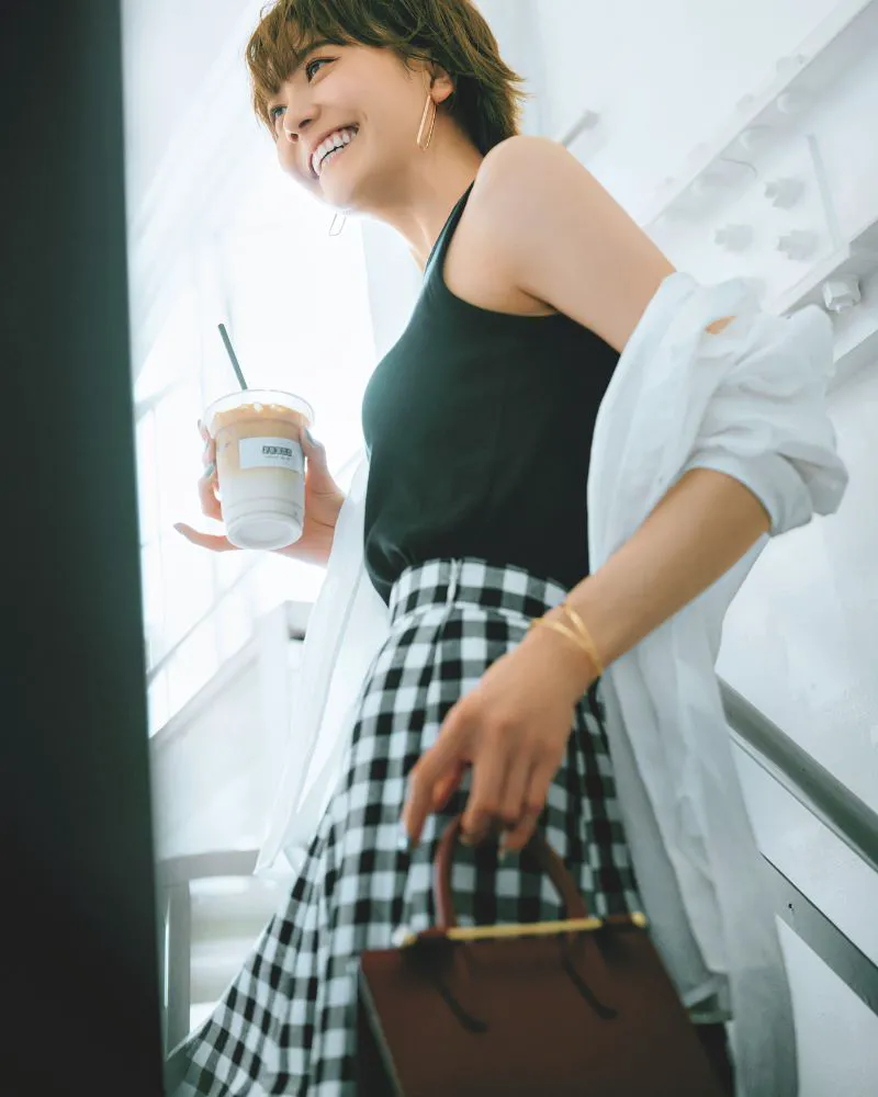 ギンガムチェックのフレアスカートにアメスリタンクと白シャツをチョイス。スカートの甘さをトップスがキリッと引き締め、緩急のついた大人コーデに。シャツはショール感覚でラフに羽織って。