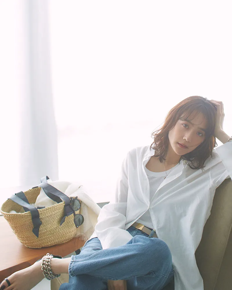 リブタンクトップとデニムというシンプルな装いには、白シャツをバサッと羽織り、シャツはボタンを1つだけ留めてコーデにリズムを。この一手間を加えるだけで、定番スタイルがアップデートされます。