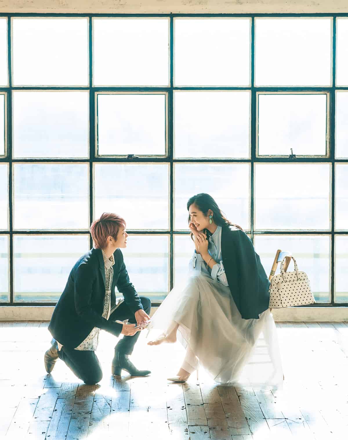 昨日のことで驚きすぎて、ちょっとぼんやりしたまま現場へ。でもいざHIROKIさんを前にすると、キュンとしちゃう。 バッグ¥45,000(ケイト・スペード ニューヨーク/ケイト・スペード カスタマーサービス)靴¥91,000(ジャンヴィト ロッシ/ジャンヴィト ロッシ ジャパン)イヤリング¥11,782(アビステ)ブレスレット¥13,000(ヴァンドームブティック/ヴァンドームブティック 銀座三越店)人差し指リング¥26,000(シャルロット ウーニング/フラッパーズ)中指リング¥16,000(ココシュニック)【HIROKI】ジャケット ¥90,000シャツ ¥33,000シューズ ¥82,000(すべてGalaabenD/ガラアーベント)パンツ(スタイリスト私物)