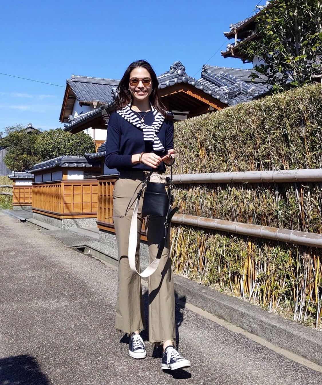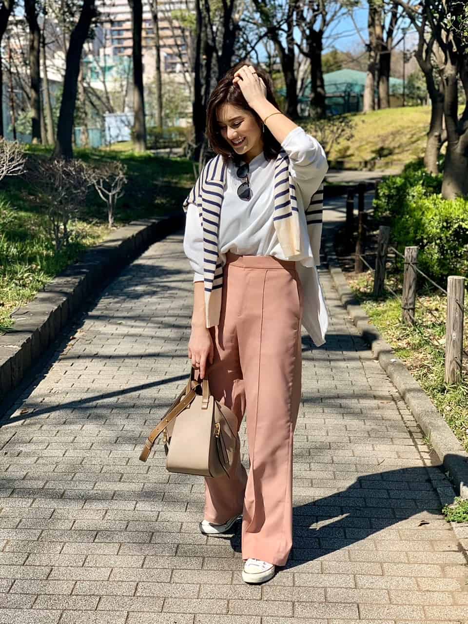 ニット:BANANA REPUBLIC カーディガン:No Brand パンツ:COUTURE D’ADAM スニーカー:CONVERSE バッグ:Chloé