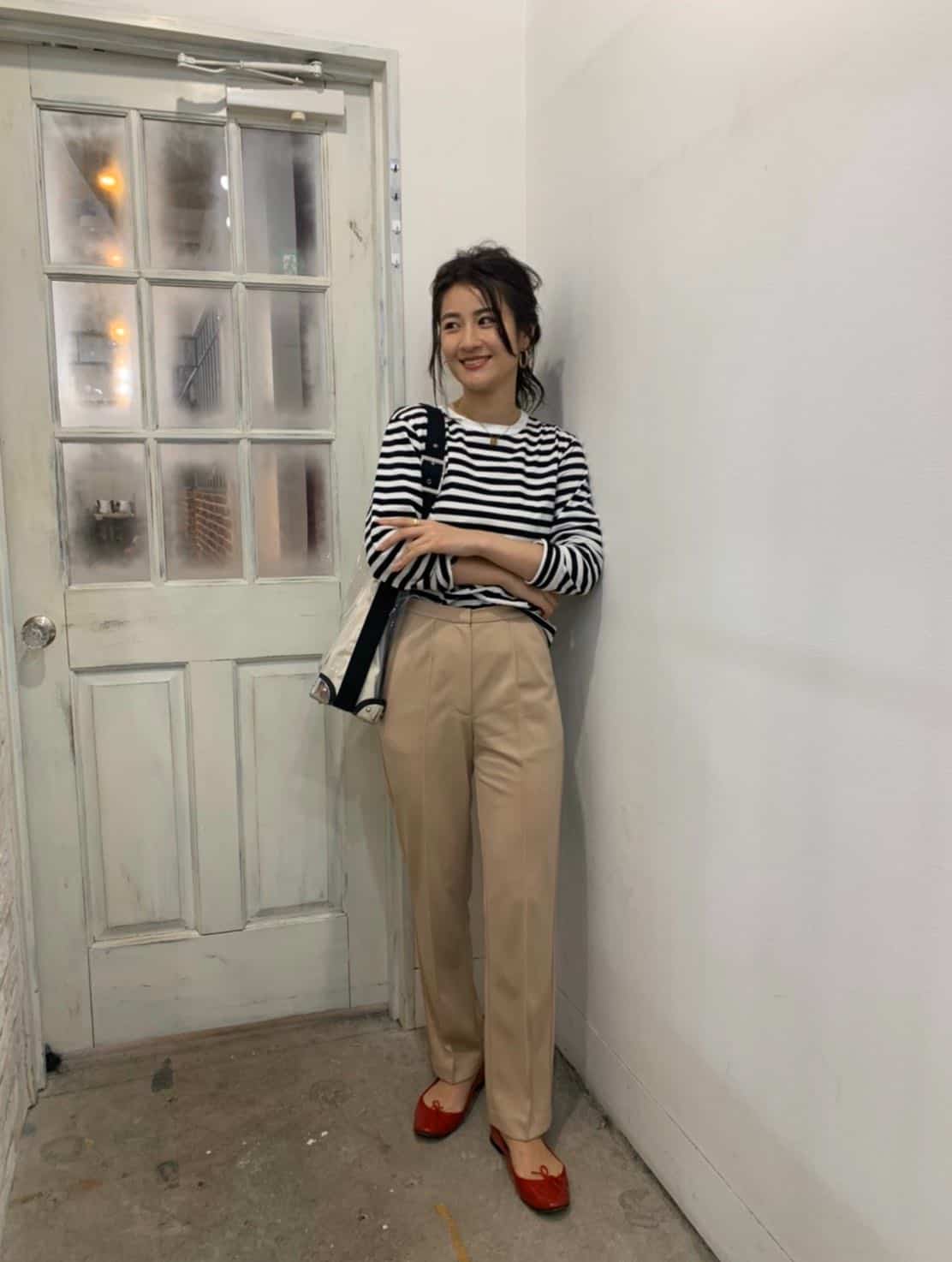 パリジャンを彷彿とさせるボーダーのパンツコーデは、袖をまくってカジュアルに着こなして。ラウンドネックが幅広めのホワイトになっているところが差をつけるポイントです。