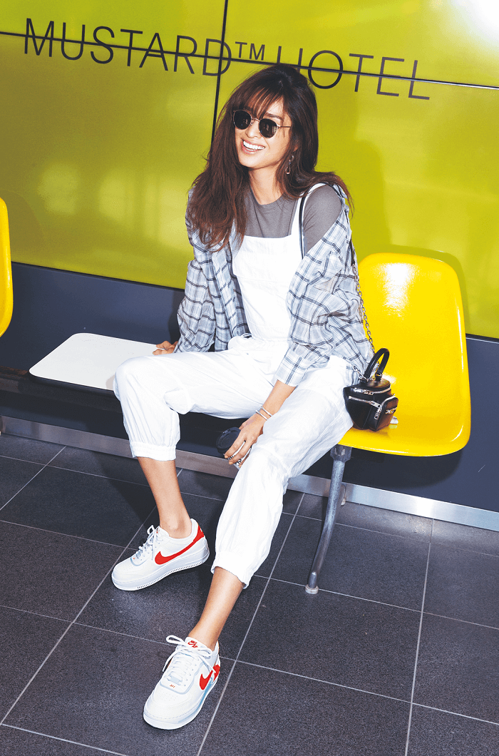 スニーカー「W AF1 SHADOW SE SU20」¥13,000(ナイキ スポーツウェア/NIKE カスタマーサービス)Tシャツ¥15,000(rag & bone/rag & bone 表参道店)シャツ¥18,000(ハチイチブランカ/UTS PR)サロペット¥26,000(styling//styling/ 新宿ルミネ1店)バッグ¥89,000(alexanderwang)サングラス¥36,000(アイヴァン/アイヴァン PR)ピアス¥10,000(ノース ワークス/UTS PR)バングル¥80,000(シンパシー オブ ソウル スタイル/フラッパーズ)