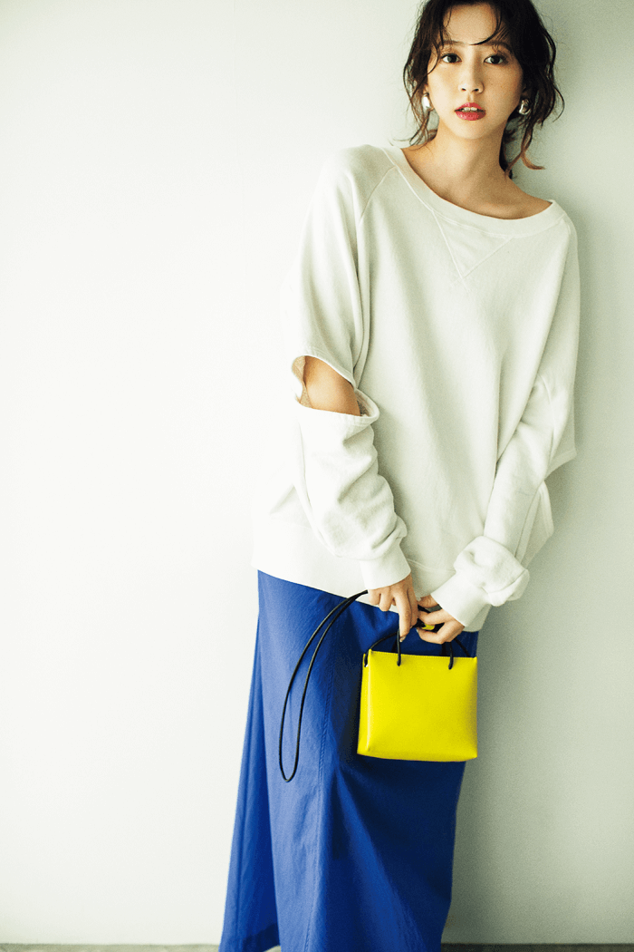 プルオーバー¥24,000(アンスクリア/アマン)スカート¥15,000(エミ アトリエ/エミ ニュウマン新宿店)バッグ¥8,500(ADINA MUSE/ADINA MUSE SHIBUYA)イヤリング¥6,682(アビステ)