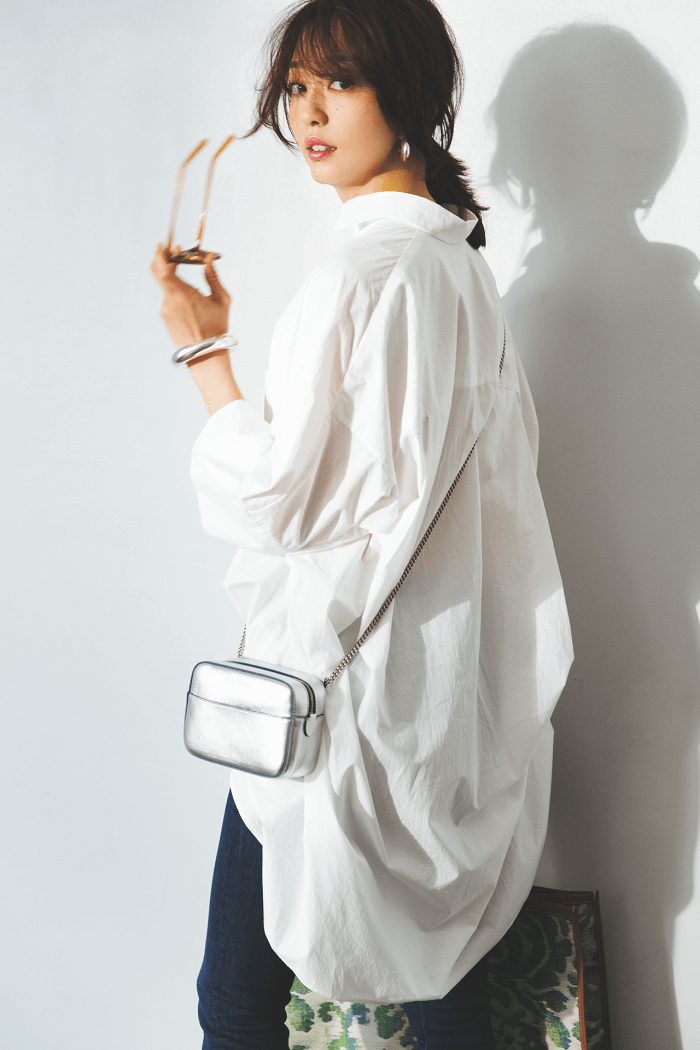 シャツ¥25,000(サクラ/インターリブ)デニム¥29,000(マザー/サザビーリーグ)ショルダーバッグ¥89,000(J&M デヴィッドソン/J&M デヴィッドソン 青山店)トートバッグ¥65,000(ア ヴァケーション/アマン)スニーカー¥32,000(デイト/ウィム ガゼット ルミネ新宿店)サングラス¥34,000(モスコット/モスコット トウキョウ)ピアス¥29,000(シンパシー オブ ソウル スタイル/フラッパーズ)バングル¥36,000(アンコモンマターズ/エストネーション)
