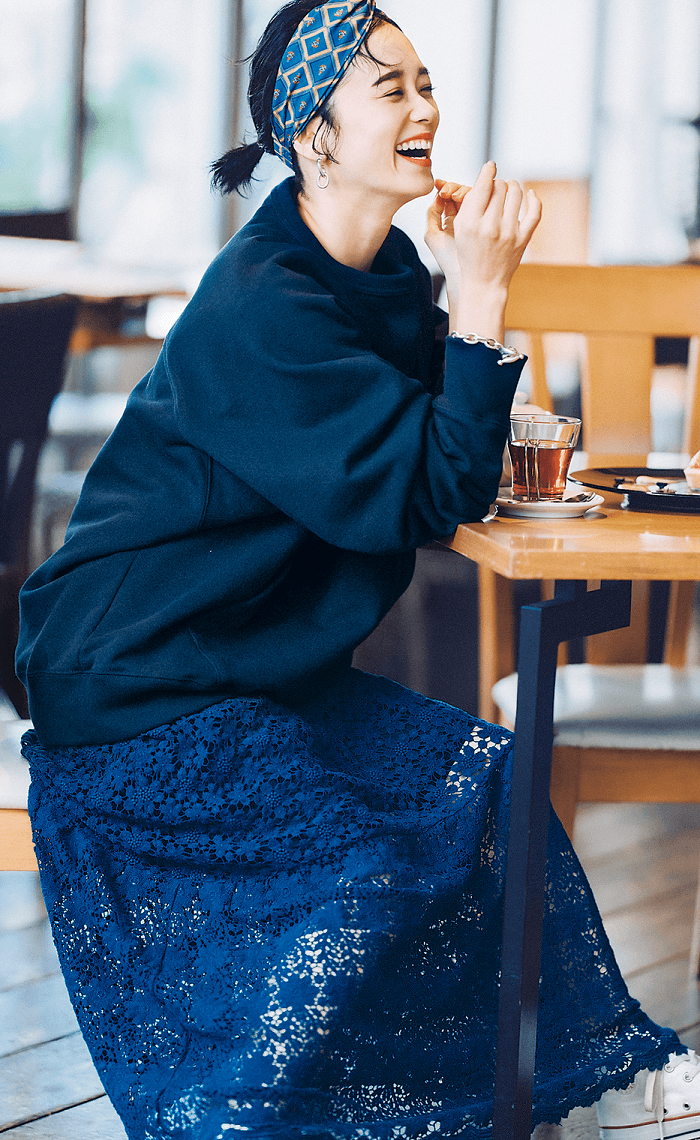 4月29日(水)、間延びして見えがちなワントーンコーデでも、透け感のある花柄レースのスカートなら、「のっぺり感」を回避するアクセントに。ヘアバンドで遊びを効かせれば、さらに上級者っぽいスタイルに。