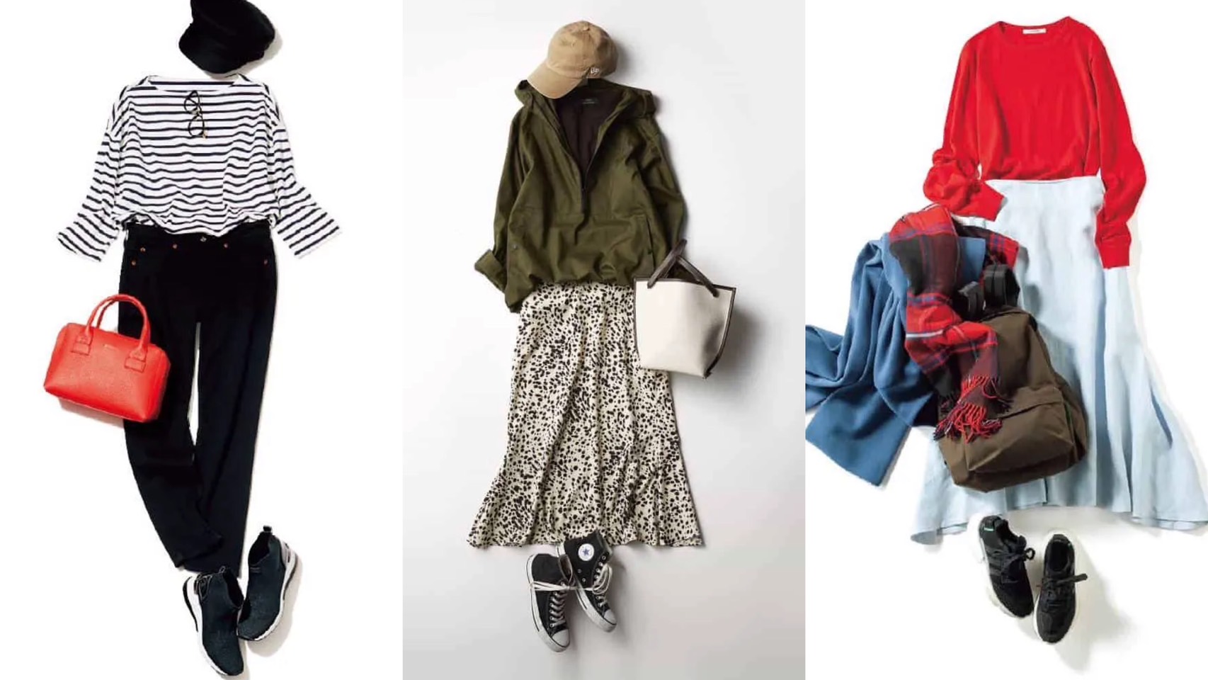 淡色の水色スカートにはあえて濃色の黒スニーカーでスパイスを効かせて。ビビッドな赤ニット投入で一気に華やかな印象に。
