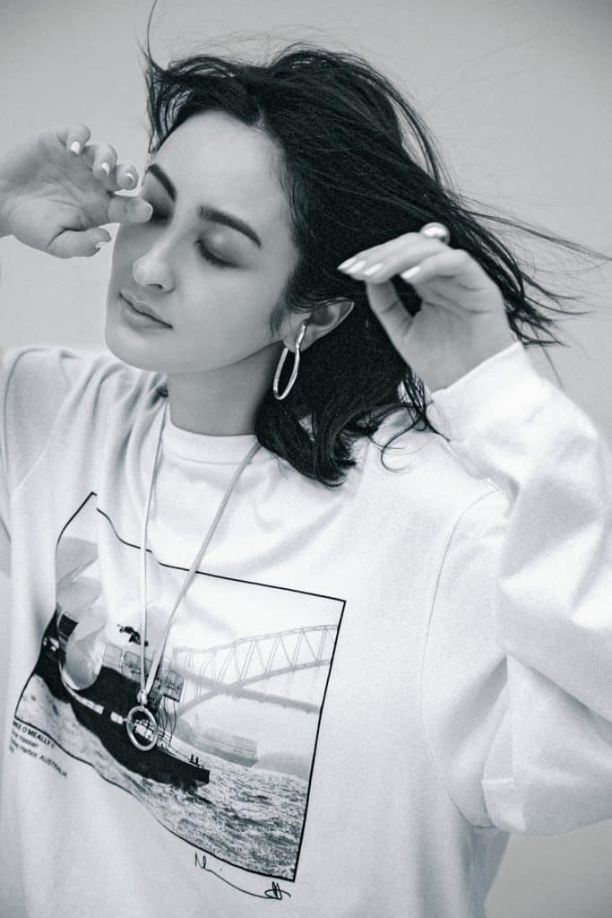 自然体でいられる服がセクシーだと思う、とスタイリングの印象を語ってくれたオーちゃん。オーバーサイズのフォトTは、ストリート要素もありながら女性らしさを引き出してくれる。