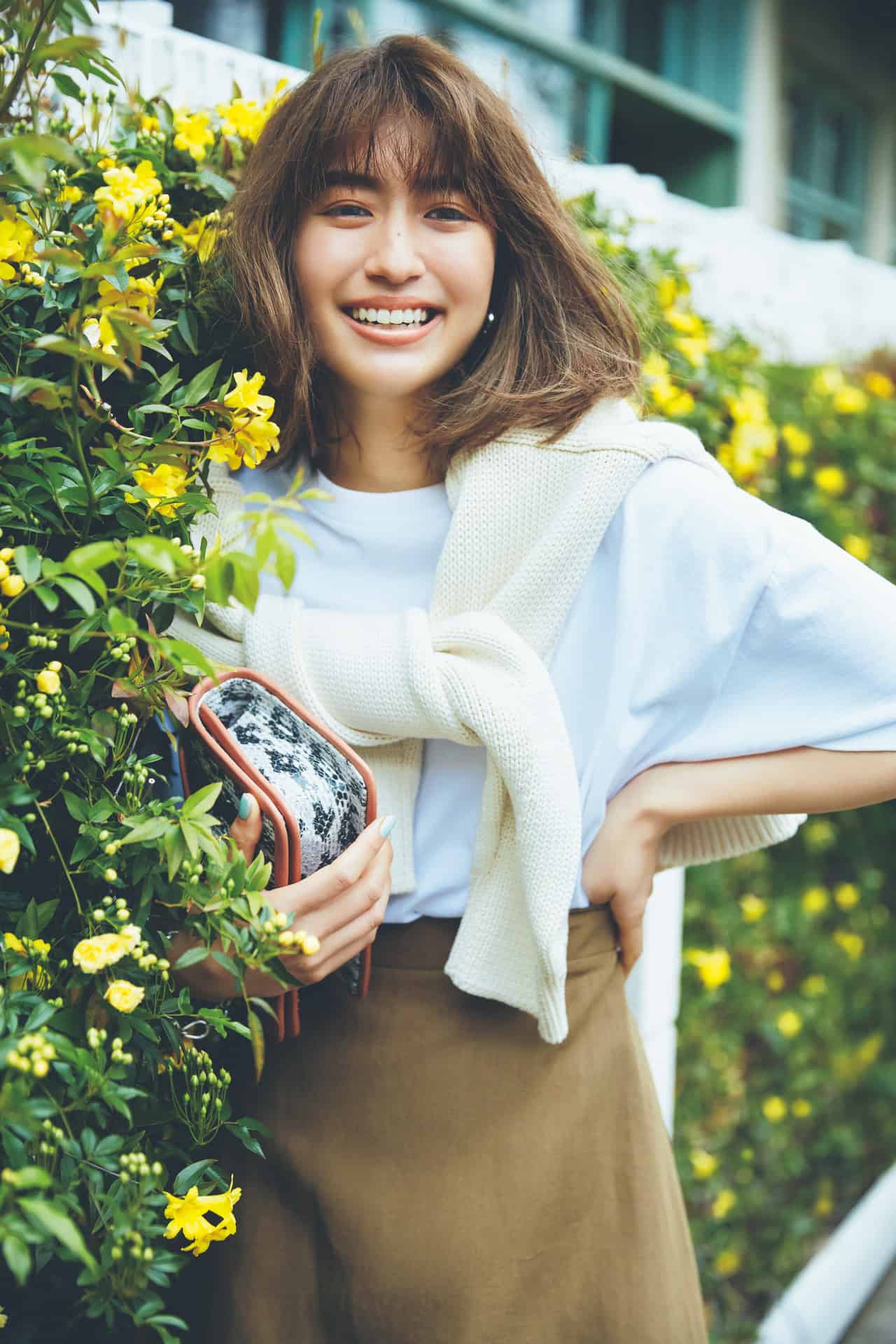 Tシャツ¥16,000 スカート¥ 59,000 ニット¥39,000(すべてエイトン/エイトン青山) バッグ¥104,000(ピエール アルディ/ピエール アルディ 東京) ピアス¥17,000 バングル¥22,000(ともにNina&Jules/THIRD MAGAZINE)