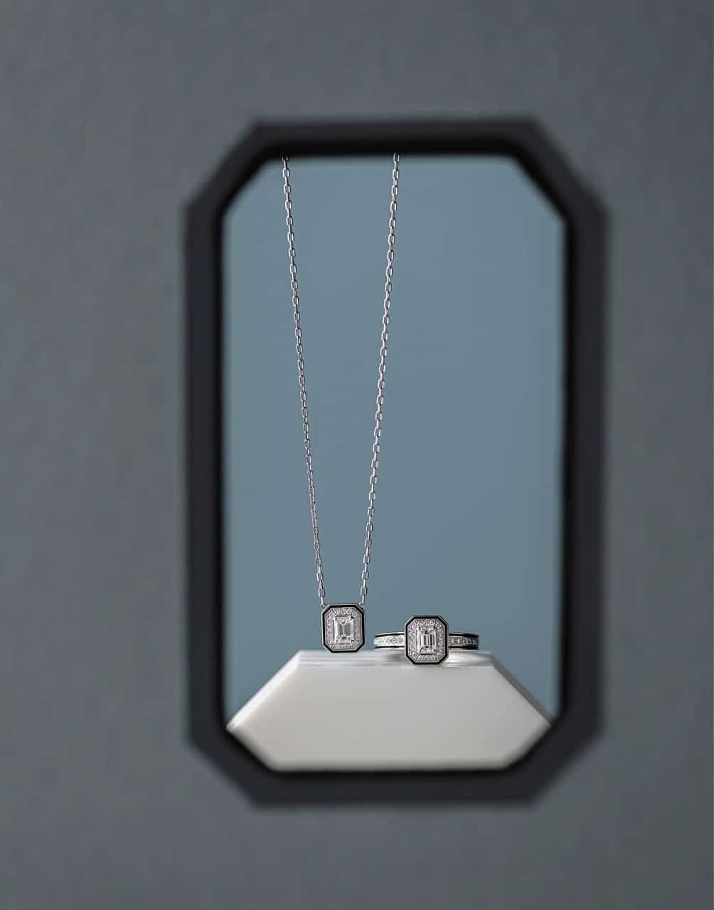 「ヴァンドーム リズレ」〈WG×D(センターストーン0.3ct)×ブラックラッカー〉リング¥763,636 ペンダント¥681,818(ともにブシュロン/ブシュロン クライアントサービス)