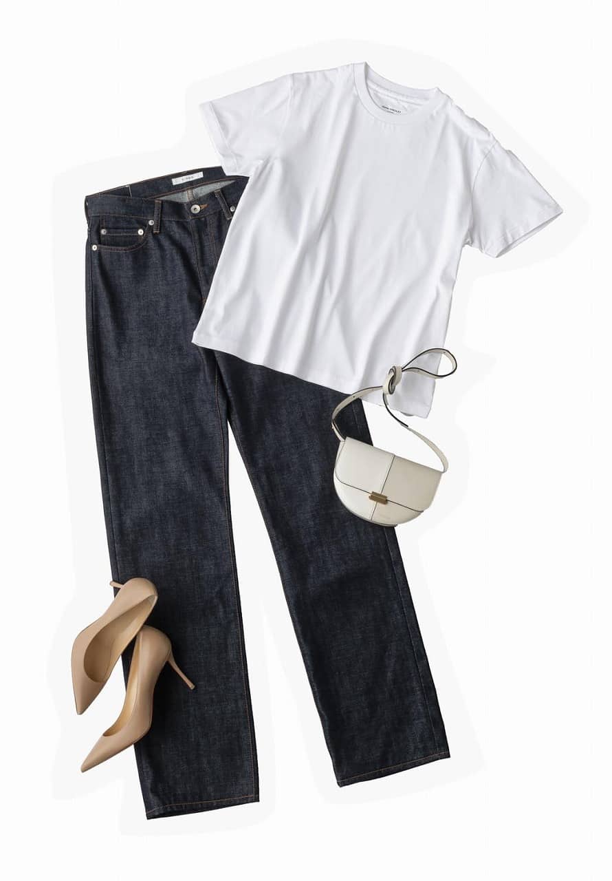 Tシャツ¥9,000(ジョン スメドレー/リーミルズ エージェンシー) デニム¥23,000(チノ/モールド) バッグ¥83,000(ワンドラー/エストネーション) 靴¥81,000(クリスチャン ルブタン/クリスチャン ルブタン ジャパン)