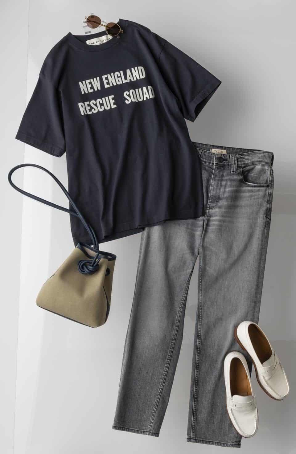Tシャツ¥9,800(THE SHINZONE/ビショップ) デニム¥23,000(ヤヌーク/カイタックインターナショナル) バッグ¥35,000(ヴァジック/ヴァジックジャパン) 靴¥168,000※オーダー価格(ジェイエムウエストン/ジェイエムウエストン 青山店) サングラス¥63,000(マイキータ/マイキータ ジャパン)