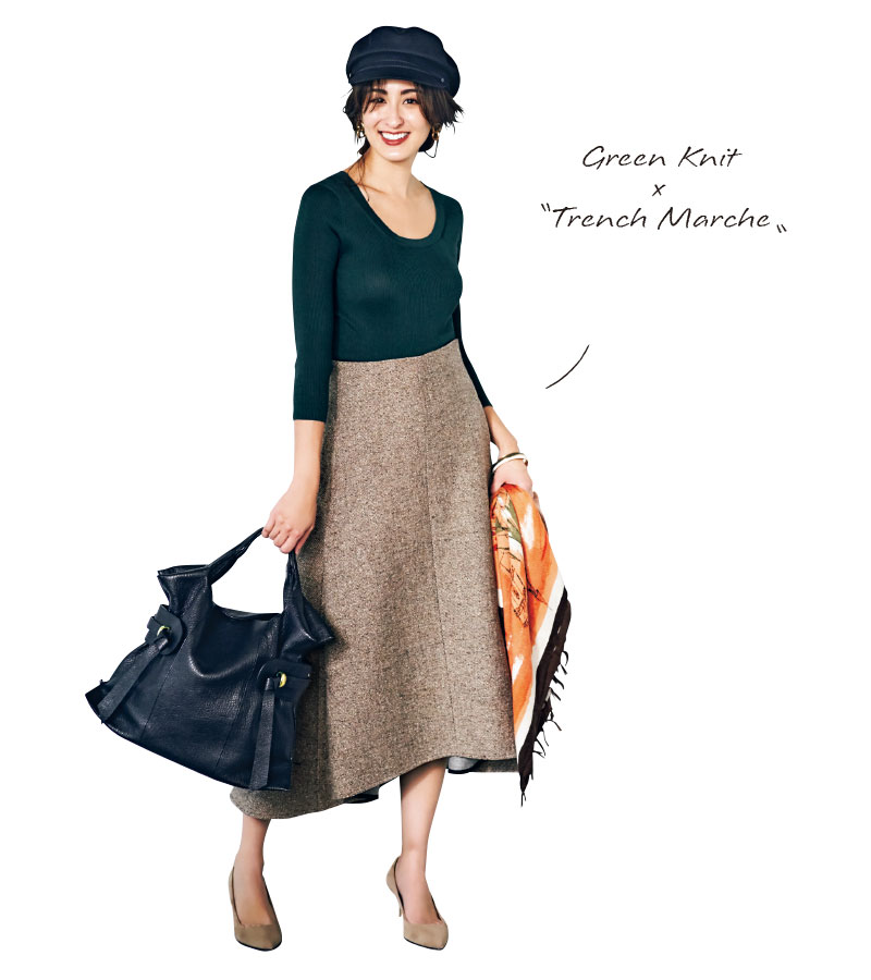 「トレンチ マルシェ」バッグ[H30×W34×D19cm]¥46,000(トフ アンド ロードストーン/T&L)ニット¥15,000(ユナイテッドアローズ/ユナイテッドアローズ 銀座店)スカート¥59,000(アンスクリア/デミルクス ビームス 新宿)帽子¥11,000(CA4LA/CA4LA ショールーム)ストール¥13,000(マニプリ/シップス 有楽町店)ピアス¥14,000(ローラ ロンバルディ/プリファー シップス NEWoMAN新宿店)ブレスレット各¥4,000(ともにシポラ アギア/シップス 有楽町店)パンプス¥25,000(CORSO ROMA9/エッセイ ラゾーナ川崎店)