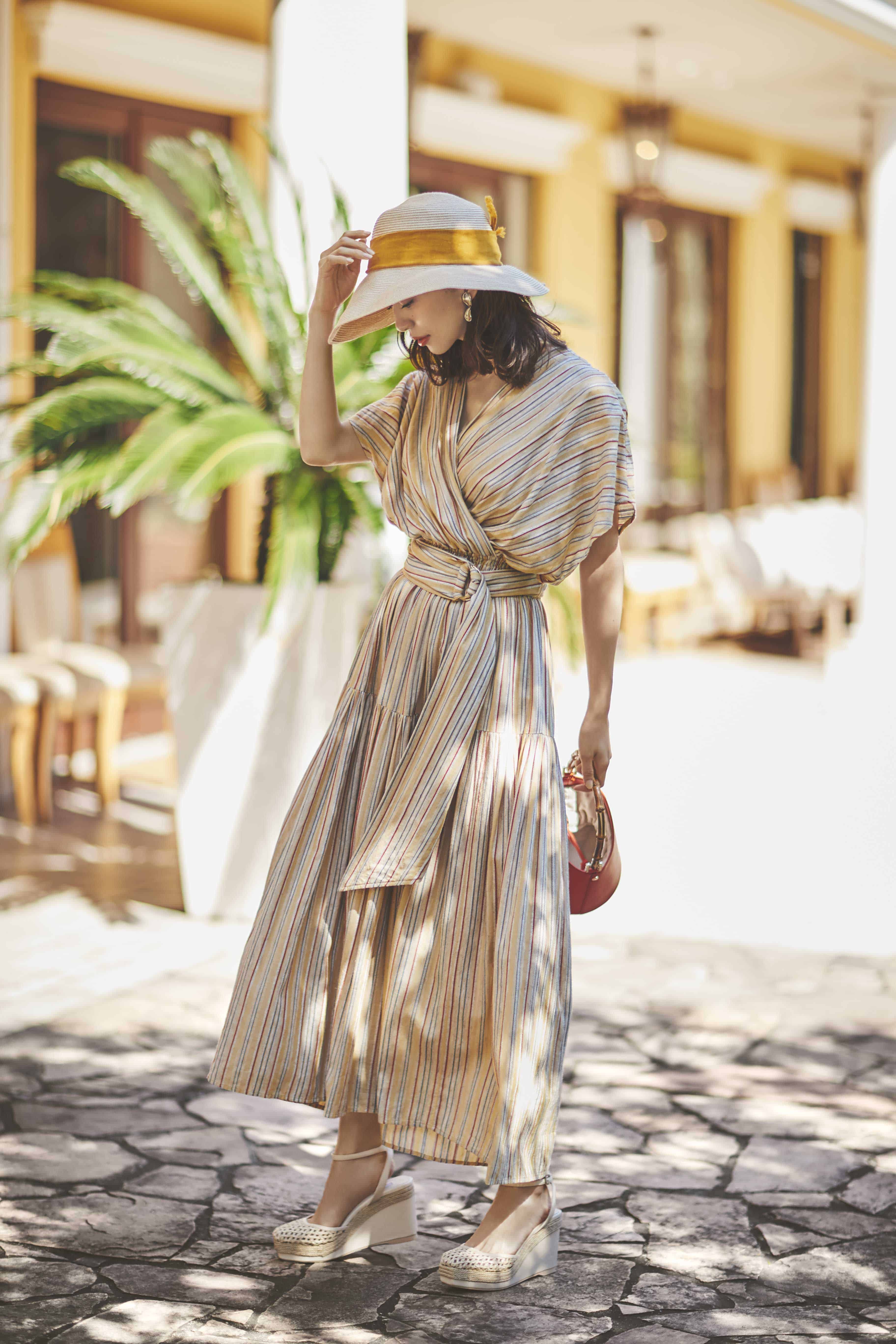 カシュクールデザインで、気になる二の腕などもオシャレにカバーしながら着られるワンピース。細かなストライプ柄も、スタイルよく見せてくれます。リゾートはもちろん、街中で着ても可愛い一枚です。カシュクールワンピース¥32,000 折りたたみハット¥17,000 イヤリング¥7,000 サンダル¥17,000 バッグ¥17,000(すべてCELFORD/CELFORD ルミネ新宿1店)