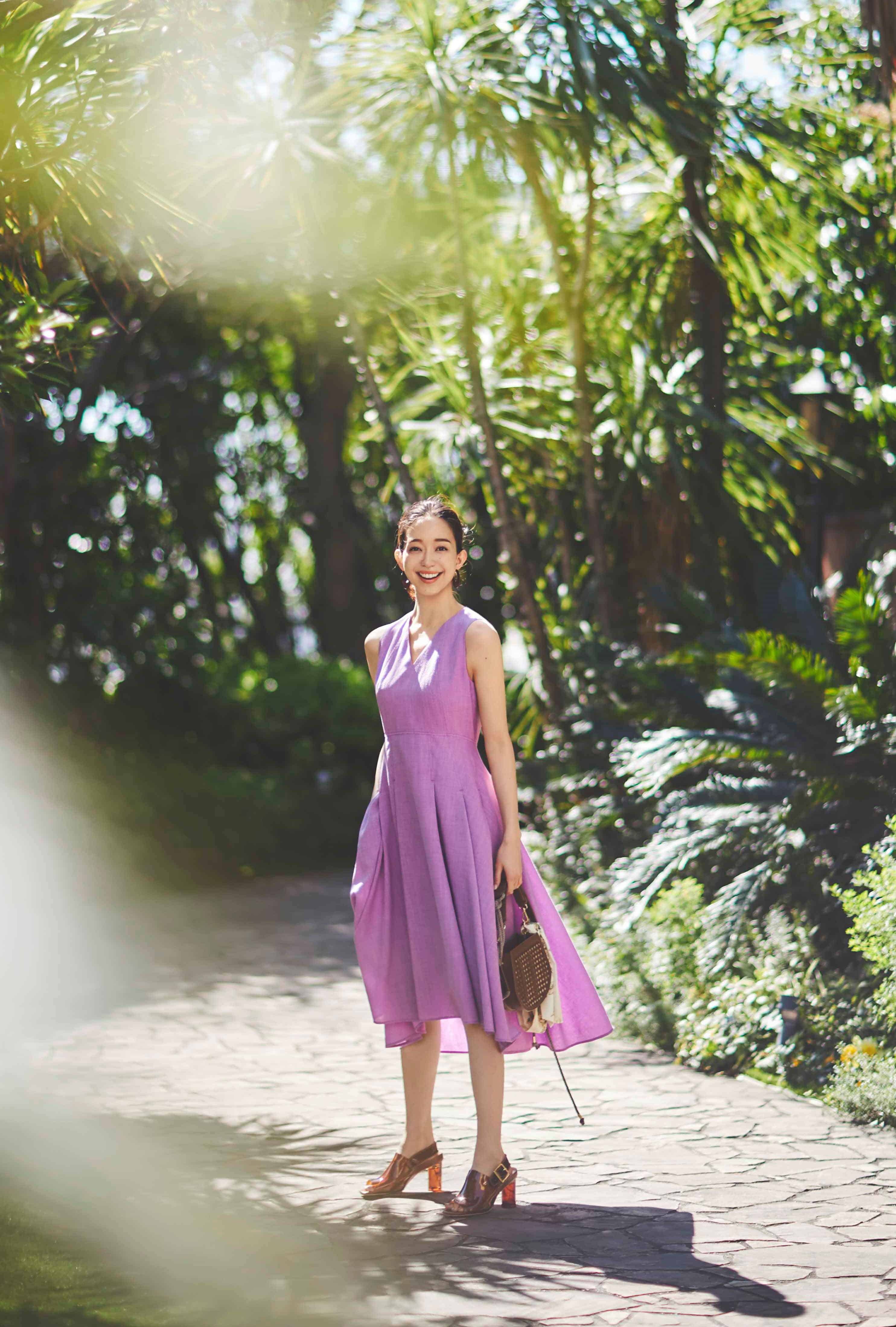 少し内に入ったノースリーブ、ハイウエスト切替など、細かいあしらいでスタイルアップ効果バツグンのセルフォードらしいワンピース。手洗い可能なのも嬉しい。鮮やかなパープルが、夏の陽射しに映えて気分よく過ごせそうです。ワンピース¥18,000 ピアス¥7,000 バッグに結んだスカーフ¥5,000 サンダル¥16,000 バッグ¥18,000(すべてCELFORD/CELFORD ルミネ新宿1店)