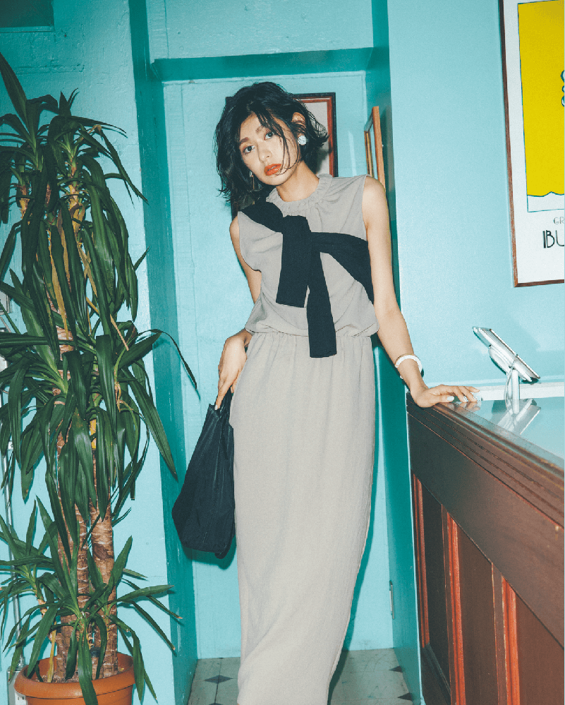 ノースリーブトップス¥13,000タイトスカート¥14,000ニットカーディガン¥9,000トートバッグ¥11,000(すべてエミ アトリエ/エミ ニュウマン新宿店)パンプス¥14,000(ダイアナ /ダイアナ 銀座本店)イ ヤリング¥30,800バングル¥33,000(ともにアビステ)
