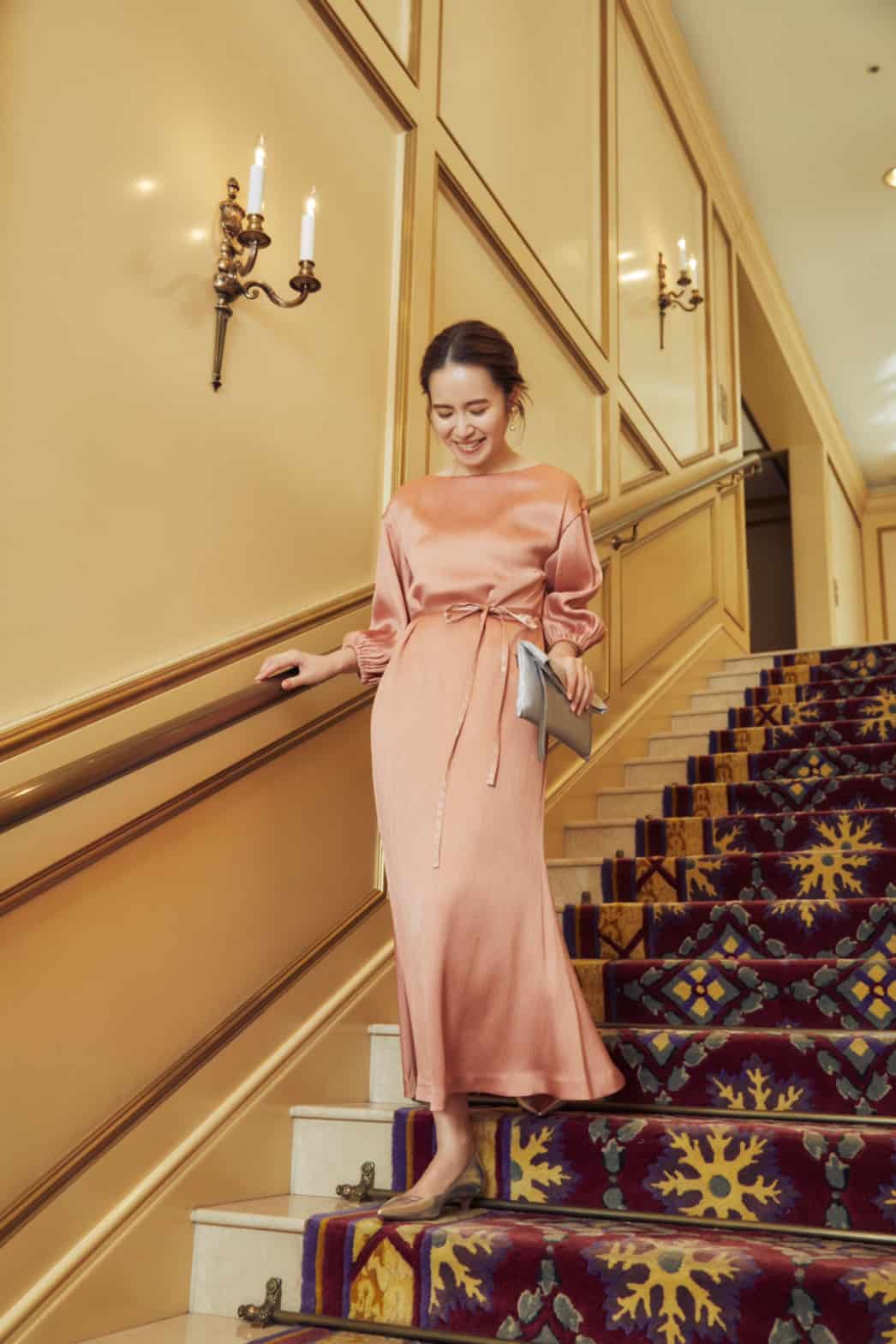 「結婚式に大事なのって、可愛さと同時に、”安心感”だとも思います。マナーが必要な場だからこそ、肩が出ないのに可愛い。かっちりしているのに今っぽい。そんな欲を叶えてあげたいという思いで作った一枚です。この素材感と、ツルッとした落ち感でレディらしさを今っぽく演出しました。女子の永遠な好きなカラーであってほしいPINKを皆さんにもっと楽しんでいただきたいです」(ディレクター三條場さん)