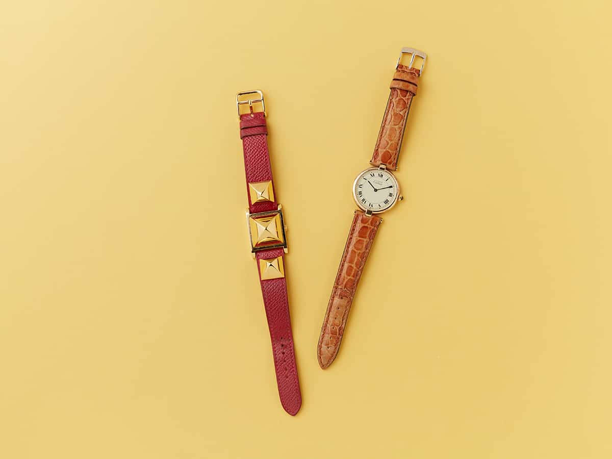 「左のエルメスのメドールは、ピラミッド型のゴールドスタッズ×赤いベルトのコンビがお気に入り。ブレスレットのように華やかです。右のカルティエのヴァンドームは、スリムなケースでキレイめにもカジュアルにも合う万能さ。どちらもヴィンテージショップで購入しましたが、現行品とはまた違った良さがあると思うので、ビビッと来る出合いを大切にしています」