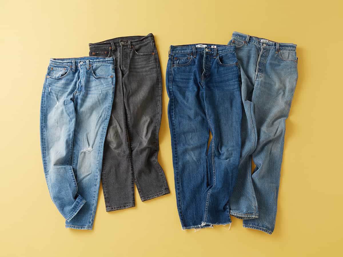 「デニムは大好きで色々履いていますが、何だかんだ使いやすくスタイルも良く見えるのはこの2ブランド。リーバイス(左の2本)と、リーバイスをベースにリメイクされているリダン(右の2本)です。切りっぱなしだったり、ダメージ加工だったり、ディテールはそれぞれ異なりますが、基本は細身のストレート。スキニーほど体型を強調せず、かといって普通のストレートよりは膝下が細い、このシルエットが一番使えます!」