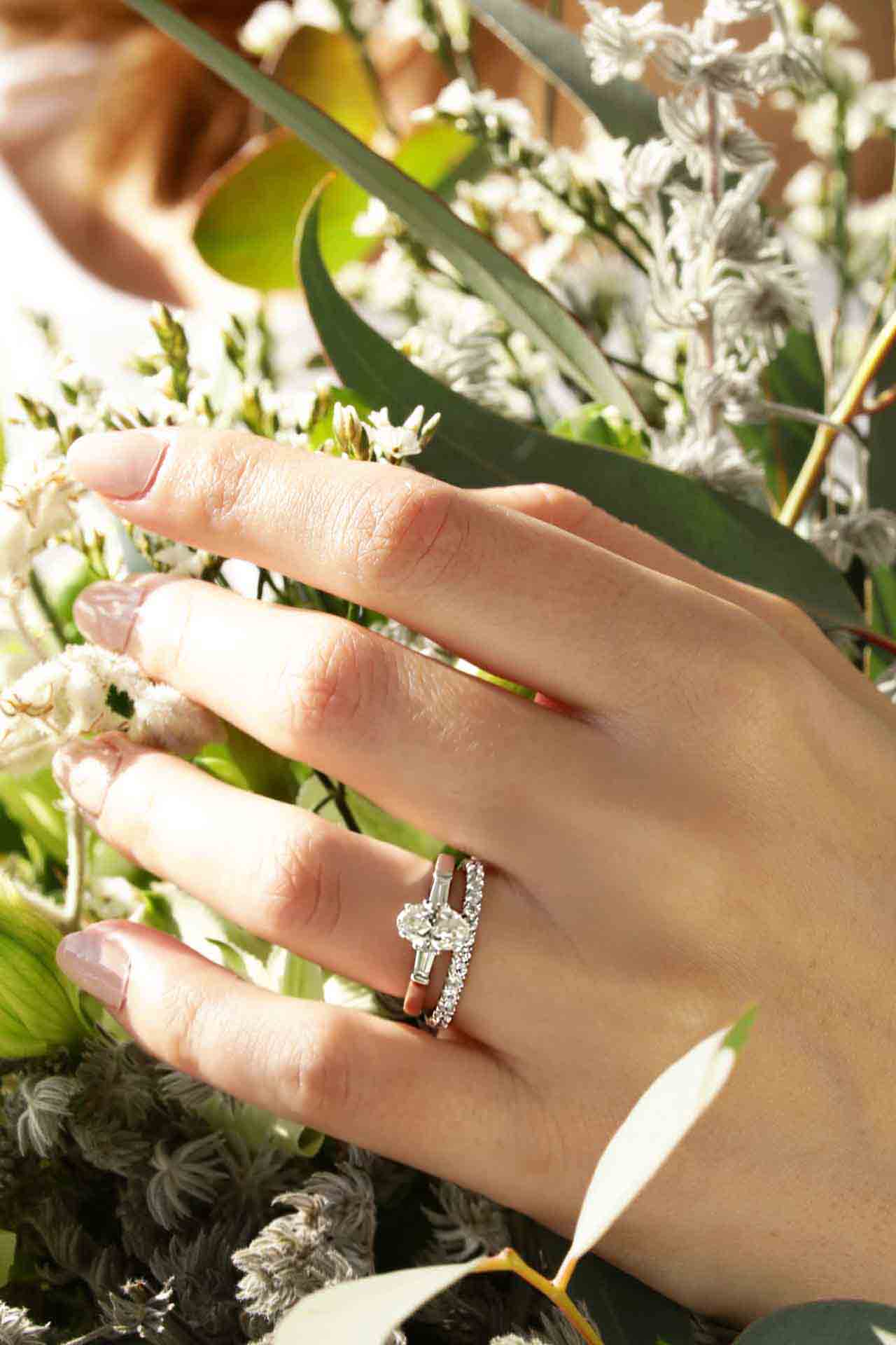センターストーンの両サイドにショルダースターンが輝くセットィングの「ザ グラフ プロミス」。ダイヤモンドの輝きを最大限に引き出し、美しさを際立たせるデザイン。センターストーンの形によって、違った表情になるのも特徴です。エンゲージリング〈Pt×DIA0.5ct〜〉¥780,000〜マリッジリング〈WG×DIA〉¥409,091イヤリング〈WG×DIA〉¥1,454,546(すべてグラフ/グラフダイヤモンズジャパン)トップス(スタイリスト私物)