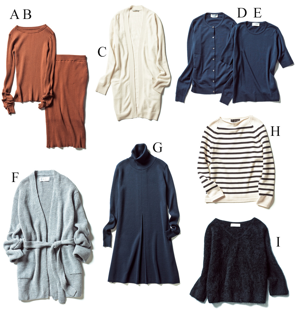 【A・B】ニットセットアップ【C】ロングカーディガン【D・E】ツインニット【F】ニットコート【G】ニットワンピース【H】ボーダーニット【I】ゆるニット