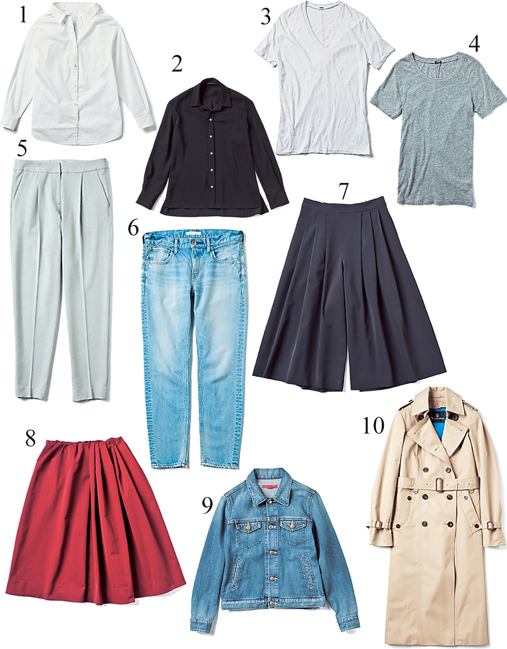 【1】白シャツ【2】とろみシャツ【3】白Tシャツ【4】グレーTシャツ【5】九分丈パンツ【6】ガールフレンドデニム【7】スカウチョ【8】フレアスカート【9】Gジャン【10】トレンチコート
