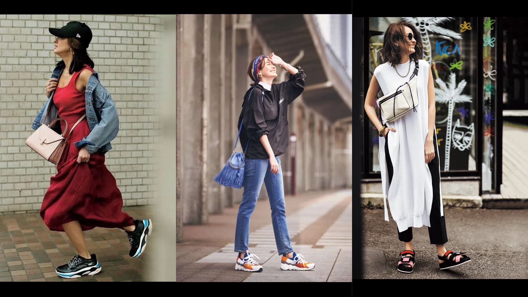 夏にぴったりの楽ちんワンピは、ビビッドなボリュームスニーカーを合わせるだけで旬な着こなしに。スポーティな小物はモノトーンを意識すると大人っぽくまとまります。