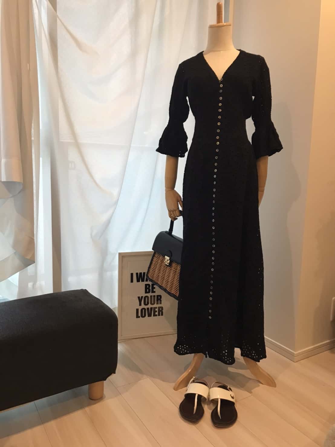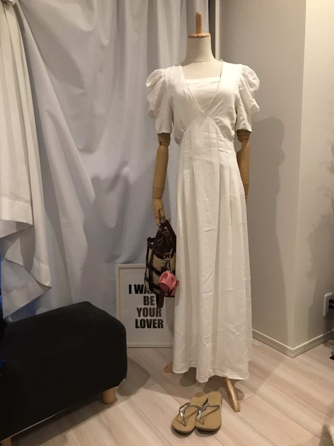 ペタンコサンダルを華やかに仕上げるには、可愛らしさのあるワンピが一役。フリルに中途半端な袖丈などストレート体型のルールからはずれるのに、Vあきデザインと、縦のボタンでさらりとスタイルアップします。