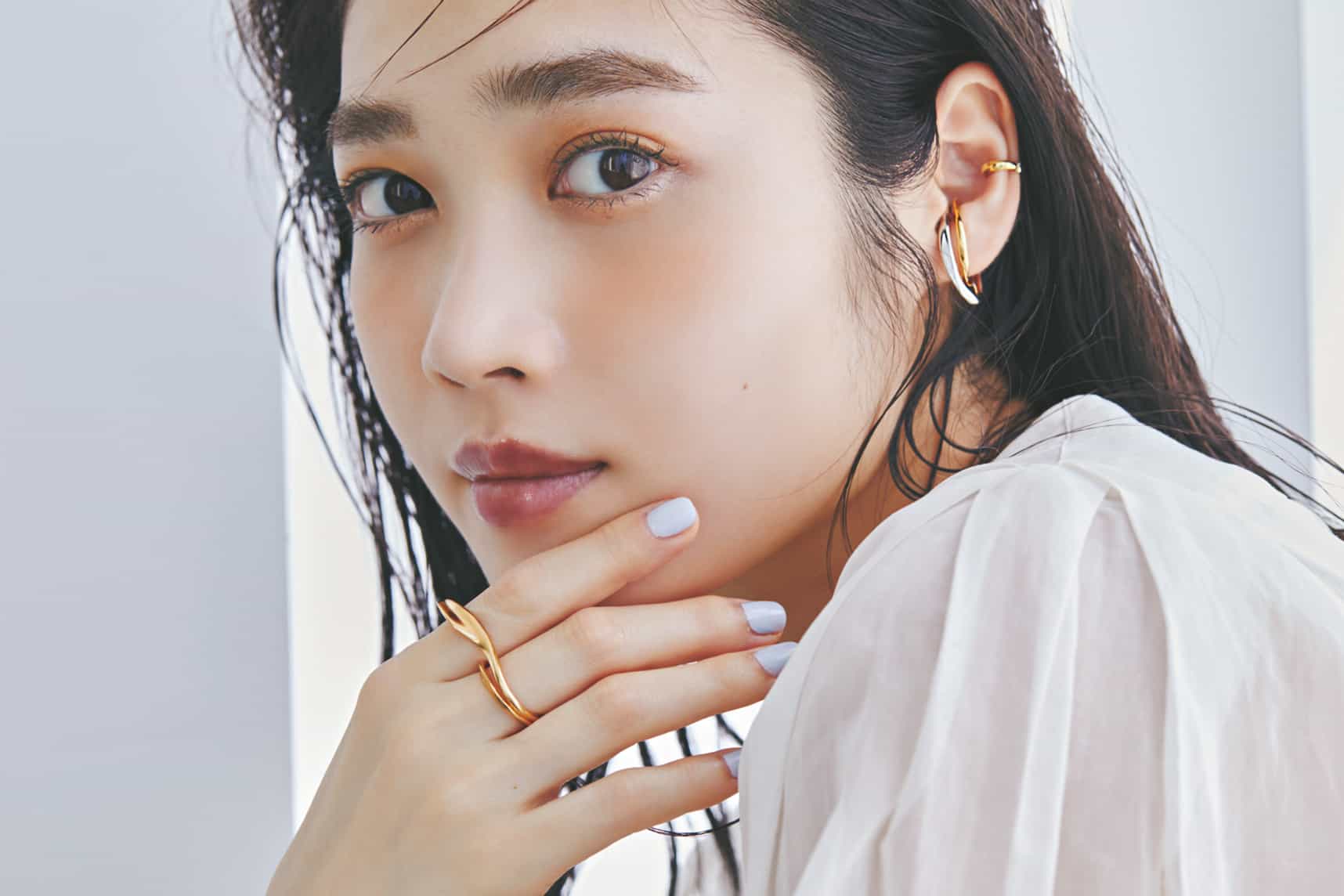 耳たぶをフープで挟むだけで簡単に着けられ、ピアスのように見えるのもイヤリング派には響くポイント。耳たぶが触れる部分の面積が広いので、ずっと着けていても痛くなりません。 ハグイヤリング〈SV925+ロジウムコーティング、SUS+ロジウムコーティング〉¥16,000(ete)ブラウス¥15,000(ローファッジ/ホワイトジョーラ)