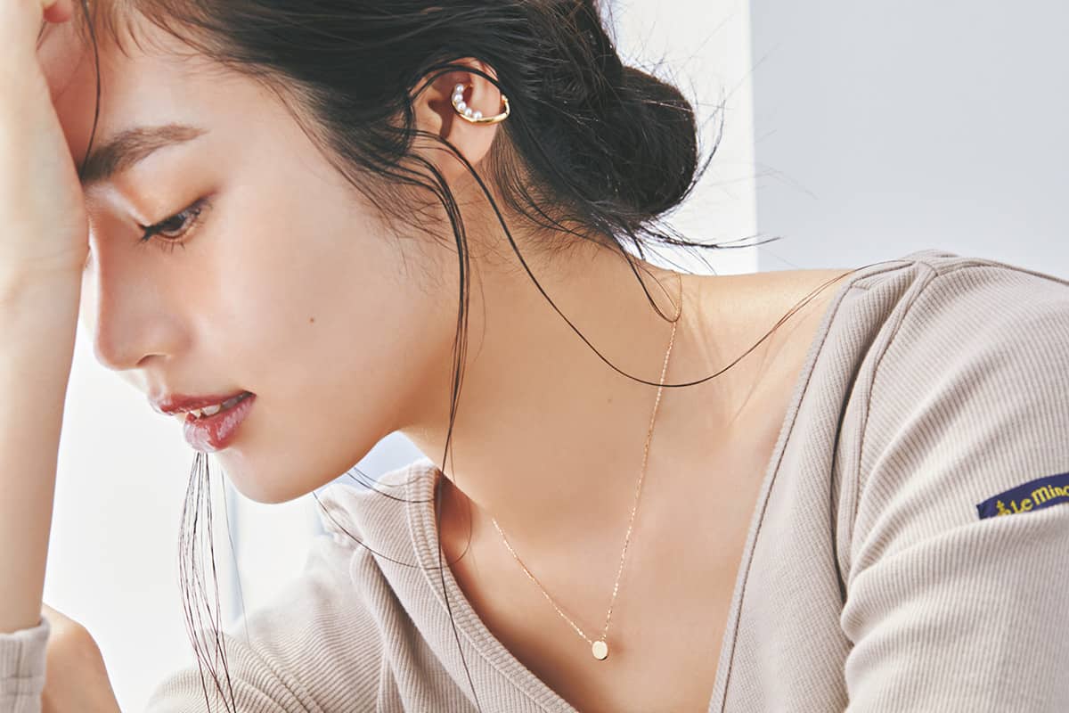 パールのハグカフとコインネックレスのコンビは、ボリューム感を計算してバランスよく。ラフなカットソーも、こびない甘さでクラシカルな趣きに。 ハグカフ〈SV925+YGコーティング、SUS+YGコーティング、淡水パール〉¥15,000ネックレス〈K10YG〉¥22,000(ともにete)カットソー¥11,000(ルミノア/ゲストリスト)