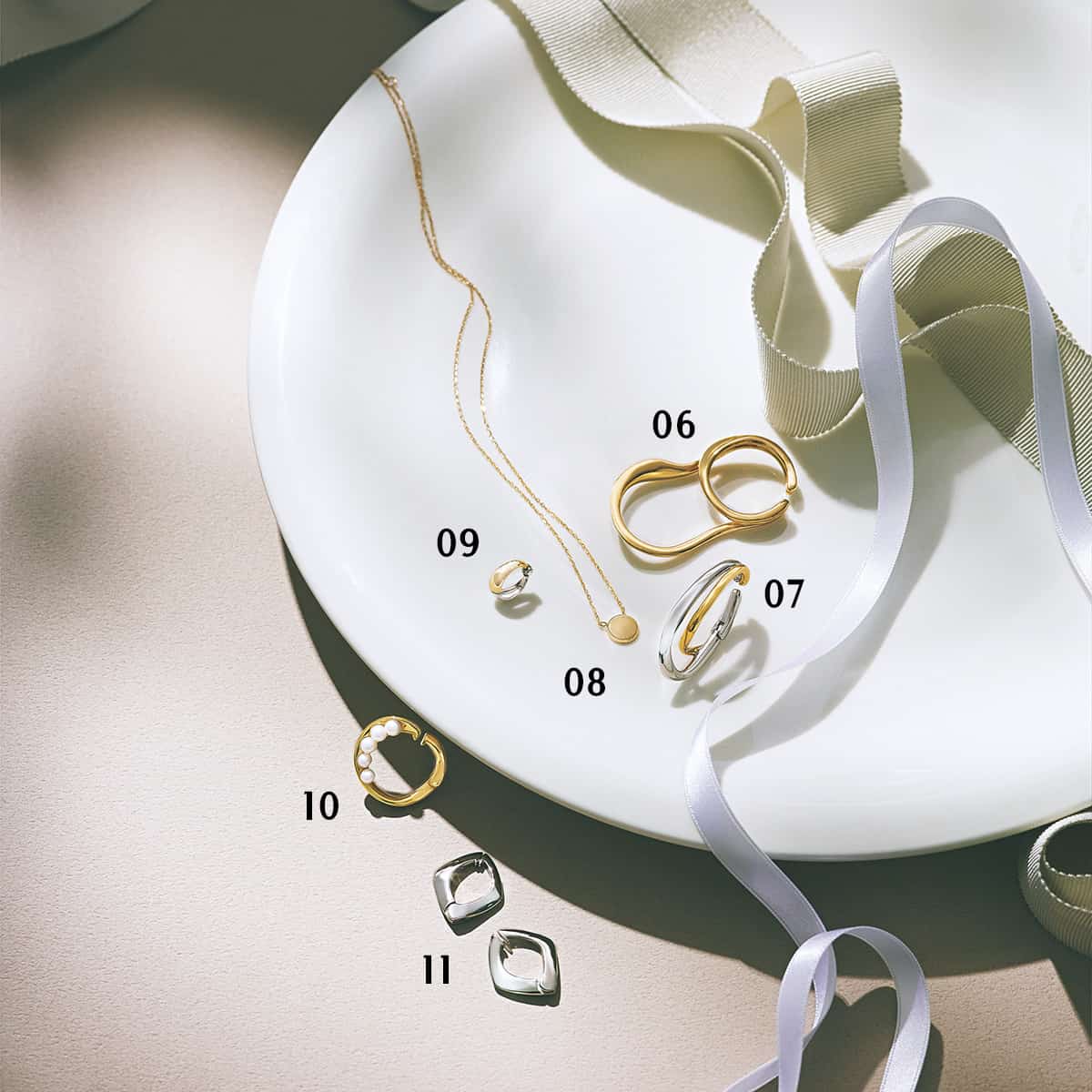 シンプルな装いが増える夏は、重ね着けを楽しんで! ハグカフ(大)〈SV925+PT/YGコーティング、SUS+PTコーティング〉¥15,000ハグカフ(小)〈K10YG、K10YG+ロジウムコーティング、SUS〉¥14,000ダブルリングカフ〈SV925+YGコーティング〉¥18,000(すべてete)ブラウス¥32,000(ジェーン スミス/UTS PR)