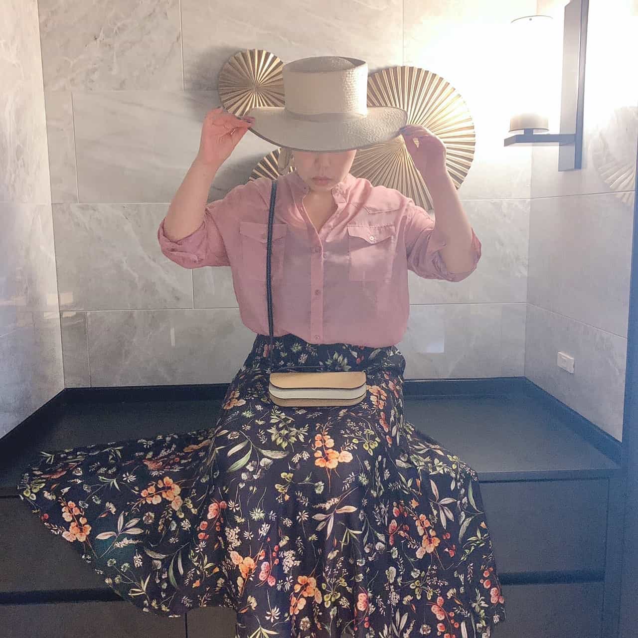 「ダークトーンのフラワープリントを合わせて、フェミニンなシャツをキレよく仕上げました。シャツのボタンを開けたり袖をラフに折り上げたりすることで、シャツの甘さを抑えてカジュアルな雰囲気に」