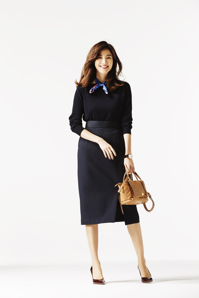 ニット¥21,000(ハウント/ハウント代官山/ゲストリスト)スカート¥21,000(INÉD)バッグ¥35,000(POTIOR/ショールーム セッション)パンプス¥14,000(バナナ・リパブリック)スカーフ¥7,000(マニプリ/フラッパーズ)時計¥95,000(サントノーレ/栄光時計)