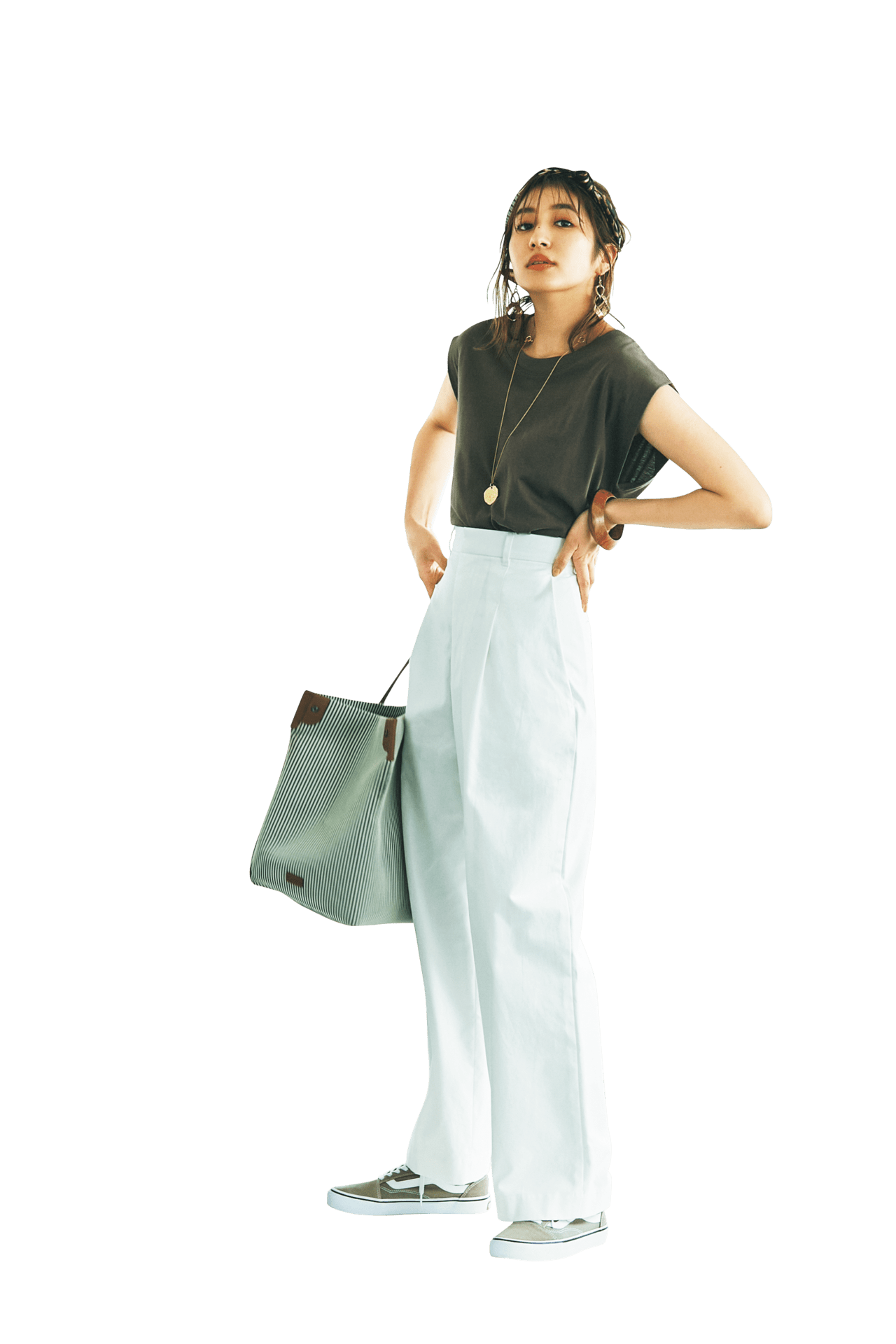 VANSならではのローテク感と大人っぽいサンドベージュが◎。名品オールドスクールは男のコっぽい雰囲気が魅力。スニーカー¥7,000(VANS/VANS JAPAN)カットソー¥4,900(ノーク)パンツ¥36,000(エイトン/エイトン青山)バッグ¥44,000(ミカイ/T&L)頭につけたスカーフ¥12,000(マニプリ/フラッパーズ)ピアス¥3,928(アビステ)ネックレス¥8,500(イン ムード/フォーティーン ショールーム)バングル¥10,000(ベンアムン/アパルトモン 青山店)