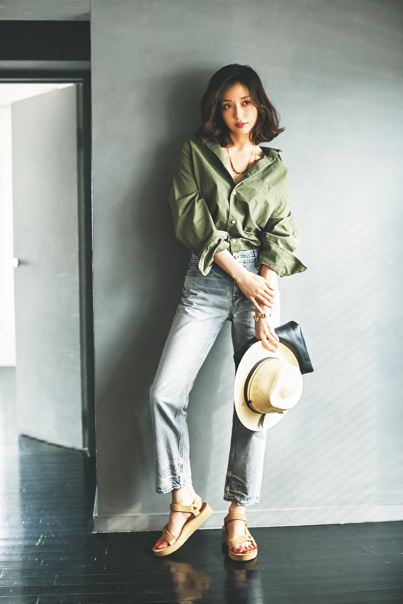 グレーデニムのラフさを抑えて上品に見せてくれるのが、レザー素材のベージュのテバ。サンダル¥14,000(テバ/デッカーズジャパン)シャツ¥36,000(マディソンブルー)デニムパンツ¥23,000(アッパーハイツ/ゲストリスト)バッグ¥38,000(ディーゼル/ディーゼル ジャパン)ハット¥70,000(ステットソン/CA4LA ショールーム)ネックレス¥6,500(マリッサ メイソン/アパルトモン 青山店)バングル¥7,855(アビステ)