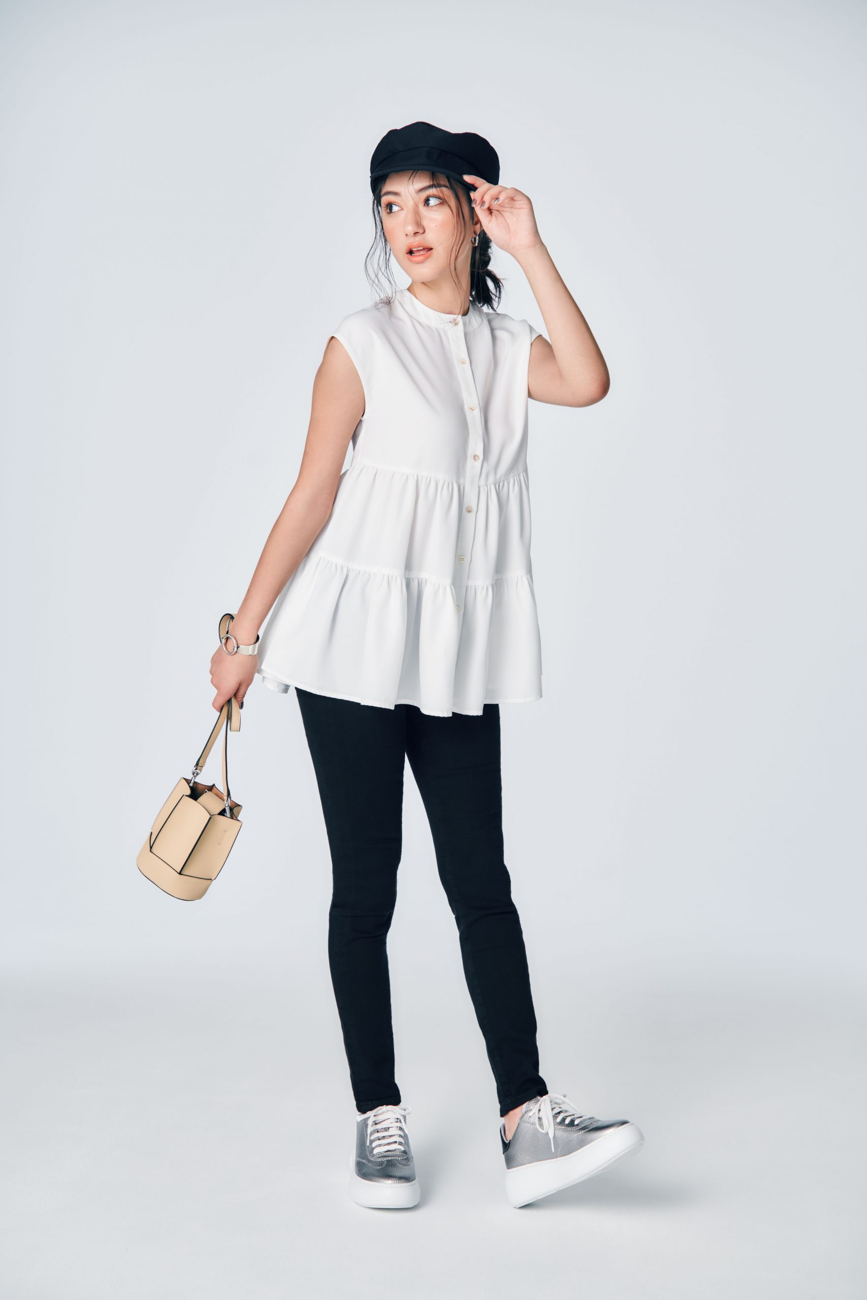 たっぷりのフレアがフェミニンな印象のAラインブラウスは、腰回りの体型カバーに一役。モノトーン配色にシルバーのスニーカーでアクセントをつければ、甘すぎず大人っぽく。キャスケットをかぶればより可愛らしい雰囲気を演出できます。