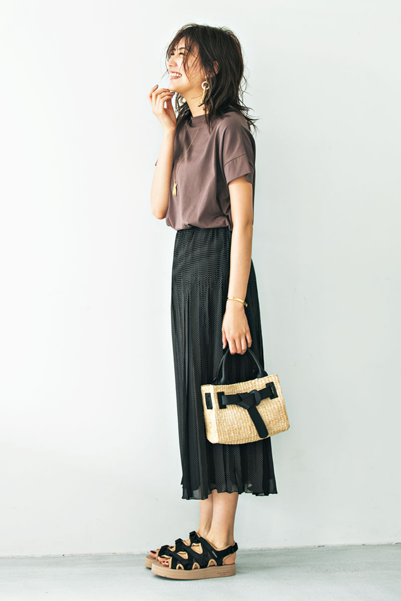 スポサンのぽってり感が主役のシンプルコーデ。シアーなスカートとスポサンの素材がさりげなくシンクロ。サンダルの黒を軸にスタイリングをまとめることで、大人っぽい印象に。サンダル/上と同じ Tシャツ¥8,000(ハンドバーク/ビームスライツ渋谷)ドットプリーツスカート¥8,600(Mila Owen/Mila Owen ルミネ新宿2店)カゴバッグ¥19,000(ヴィオラドーロ/ピーチ)イヤリング¥7,855バングル¥6,873(ともにアビステ)ネックレス¥16,000(アルス/ジェンマアルス)