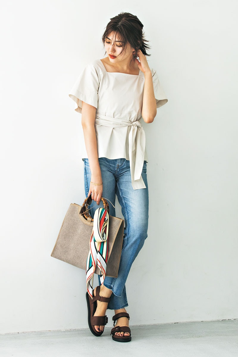 淡いトーンのデニムコーデをこっくりとしたブラウンで大人のムードに。レザースニーカーのバリエーション的感覚の、清潔感漂う着こなしにお似合いです。サンダル/上と同じ ブラウス¥9,800(アンクレイヴ)デニムパンツ¥24,000(アッパーハイツ/ゲストリスト)バッグ¥23,000(アロン/CPR TOKYO)スカーフ¥16,000(マニプリ/フラッパーズ)サングラス¥36,000(アイヴァン/アイヴァン PR)バングル¥955(アビステ)