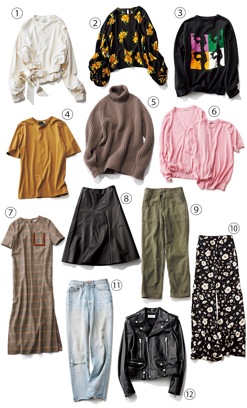 ❶THE GREAT EROSのカシュクールブラウス ❷ナンバーシックスの花柄ブラウス ❸ヴィンテージのスウェットトップス ❹エイトンのTシャツ ❺スローンのタートルニット ❻スローンのアンサンブルニット ❼エムマーティンのチェックワンピース ❽ラグ&ボーンのレザースカート ❾ウィム ガゼットのカーキベイカーパンツ ❿REFORMATIONの花柄ワイドパンツ ⓫ヴィンテージリーバイス®のデニムパンツ ⓬サンローランのライダースジャケット